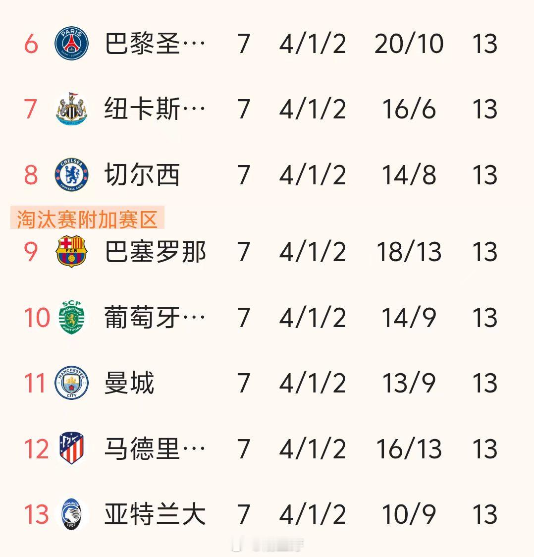 巴萨,欧冠前八有多远?欧冠预赛还剩最后一轮,巴萨积13分排第九位,距前八只差一位,但是光是积13分的一共就有8支球队,那么巴萨最后一轮进前八直接进入淘汰赛的概率有多大呢?巴萨最后一轮主场对阵哥本哈根,虽然佩德里不能出战,但凭实力,巴萨取胜应该在情理之中。那么我们分析一下当前形势。首先巴萨战平几乎就没希望,若负肯定进不了前八。假如取胜,那么目前前八中的第五名巴黎和第六名纽卡最后一轮将死磕,两队目前和巴萨同积13分,所以不论结果如何,其中至少一队积分少于巴萨,其它同积13分的切尔西(对那不勒斯),葡萄牙体育(毕尔巴鄂竞技),曼城(加拉塔萨雷),马竞(博德闪耀),亚特兰大(圣吉罗斯)。除了马竞和亚特兰大,其它球队都是死磕,而如今巴萨净胜球5个,所以说如果巴萨取胜积16分,可以说90%概率能进前八,当然净胜球越多越好,祈祷巴萨好运!巴萨欧冠