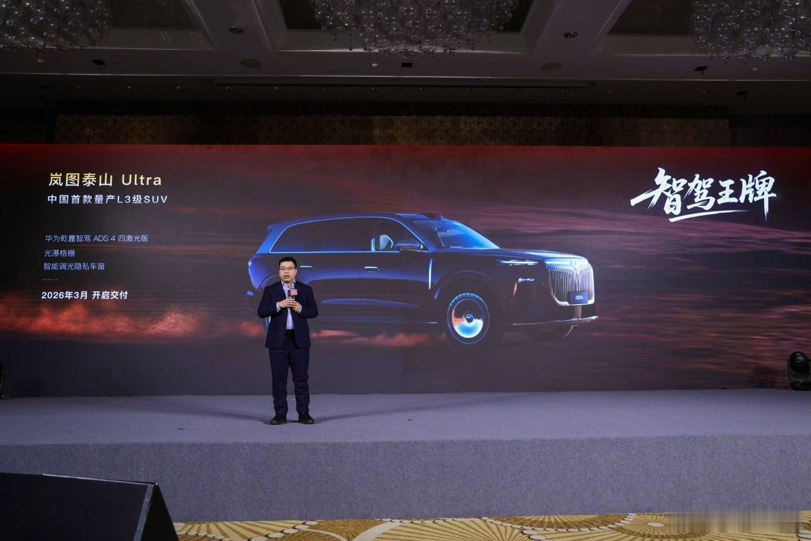 华为首款量产 L3 级 SUV真的要来了!1月28日,岚图汽车在年终媒体答谢会上宣布,岚图泰山Ultra将于今年3月正式开启交付。作为岚图汽车冲击L3赛道的重磅产品,岚图泰山Ultra完全按照L3级自动驾驶架构设计,并搭载最新的华为乾崑智驾四激光方案。作为新时代旗舰大六座SUV,岚图泰山自上市以来就凭借顶格华为智能技术、行业首搭三腔空悬、EDC魔毯功能、双向16°后轮转向、AI云舒座椅、800V+5C超快充等领先技术和配置,赢得高端用户青睐。相信随着岚图泰山Ultra的3月交付,岚图泰山将进入加速突破的新阶段,想买车的朋友可以等年后3月~华系首款L3级SUV3月量产岚图泰山四激光版确定3月交付邵明峰:三王一炸打明牌