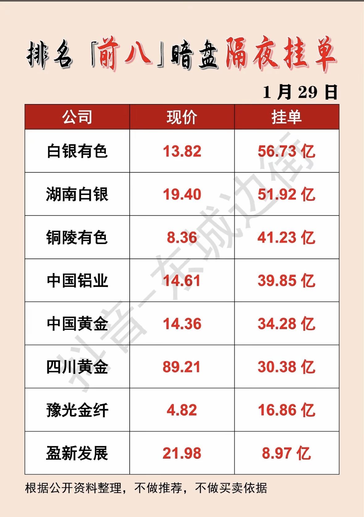 1月29日「前八」暗盘隔夜挂单榜,白银有色领跑! "白银有色领涨暗盘,湖南白银、铜陵有色紧随其后,黄金铝业板块活跃,数据仅供参考不作推荐。"
