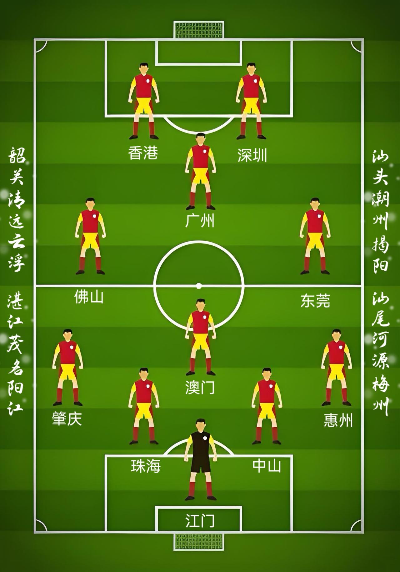 广东发展就像踢足球。 影子前锋:深圳。经济总量最高,产业、科技最发达,发展速度最快。 前腰:广州。老大哥,政治、文化、交通、教育中心,堪称球场组织者和节拍器。 边前卫:佛山、东莞,工业发达,可协助前场进攻,形成深圳都市圈、广州都市圈,退则以制造业为压舱石,与头部城市形成前店后厂。 右后卫:惠州,主要是制造业,是经济发展大后方,作为深圳都市圈成员,又可以助攻深圳、东莞,所以与深莞连成一线,又处于珠江之右,成为右后卫。 左后卫:肇庆,作为广佛后花园,主要承接广佛产业转移,作为广州都市圈成为,又可以助攻广佛,所以与广佛连为一线,且处于珠江之左,成为左后卫。 中后卫:中山、珠海。主要是因为这两个城市相对独立于广深都市圈,且不亮眼。它俩前与澳门组合,后与江门共同组合,形成后防核心。因为深中通道通车,中山与深圳联系更加紧密,所以中山是右后卫。 守门员:江门。因为它带了一个门字,且似乎与谁都不沾边,算是跟珠海、中山、澳门比较亲近。 为什么香港、澳门在其中呢?因为现在言必粤港澳大湾区,说来说去都是这11个城市。香港、澳门虽然不属于广东,但是与广东发展密不可分,甚至比珠三角与非珠地区关系还密切,所以可以算作外援。 突前前锋:香港。香港是最发达、最开放、最国际化的珠三角城市,必然是这只球队的旗帜与尖刀。 后腰:澳门。这是组织型后腰,作为特别行政区,是东西方沟通串联的桥梁。
