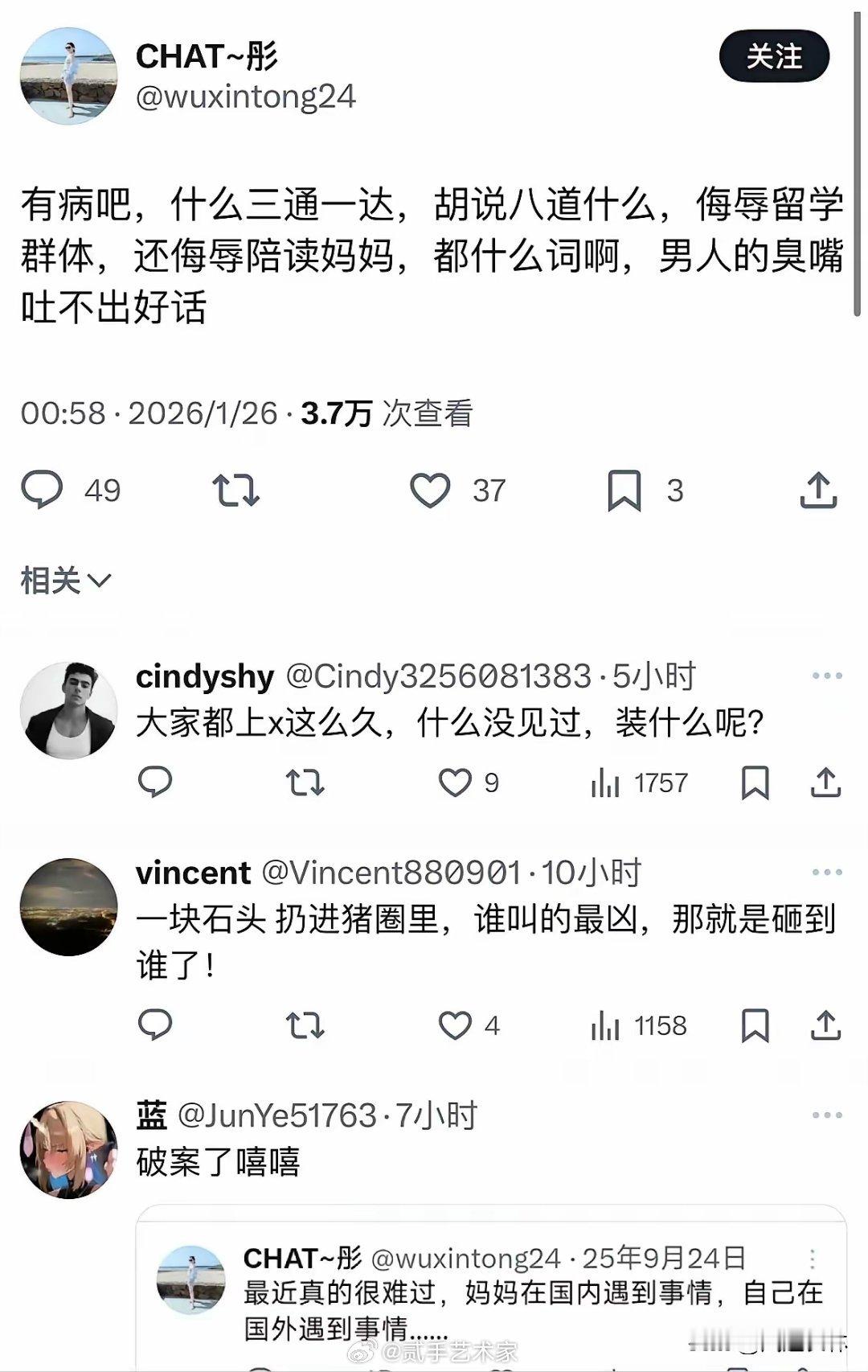 留子和陪读妈妈全都偷偷回国打胎???有句话怎么说来着往猪圈里头扔一个石头,哪个猪叫的声音最大啊,就是砸的谁。