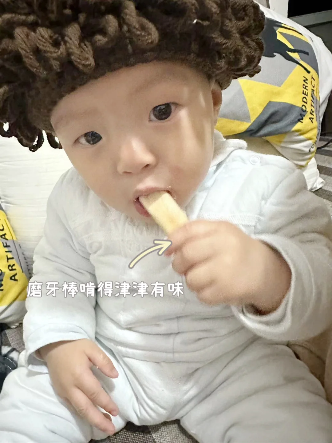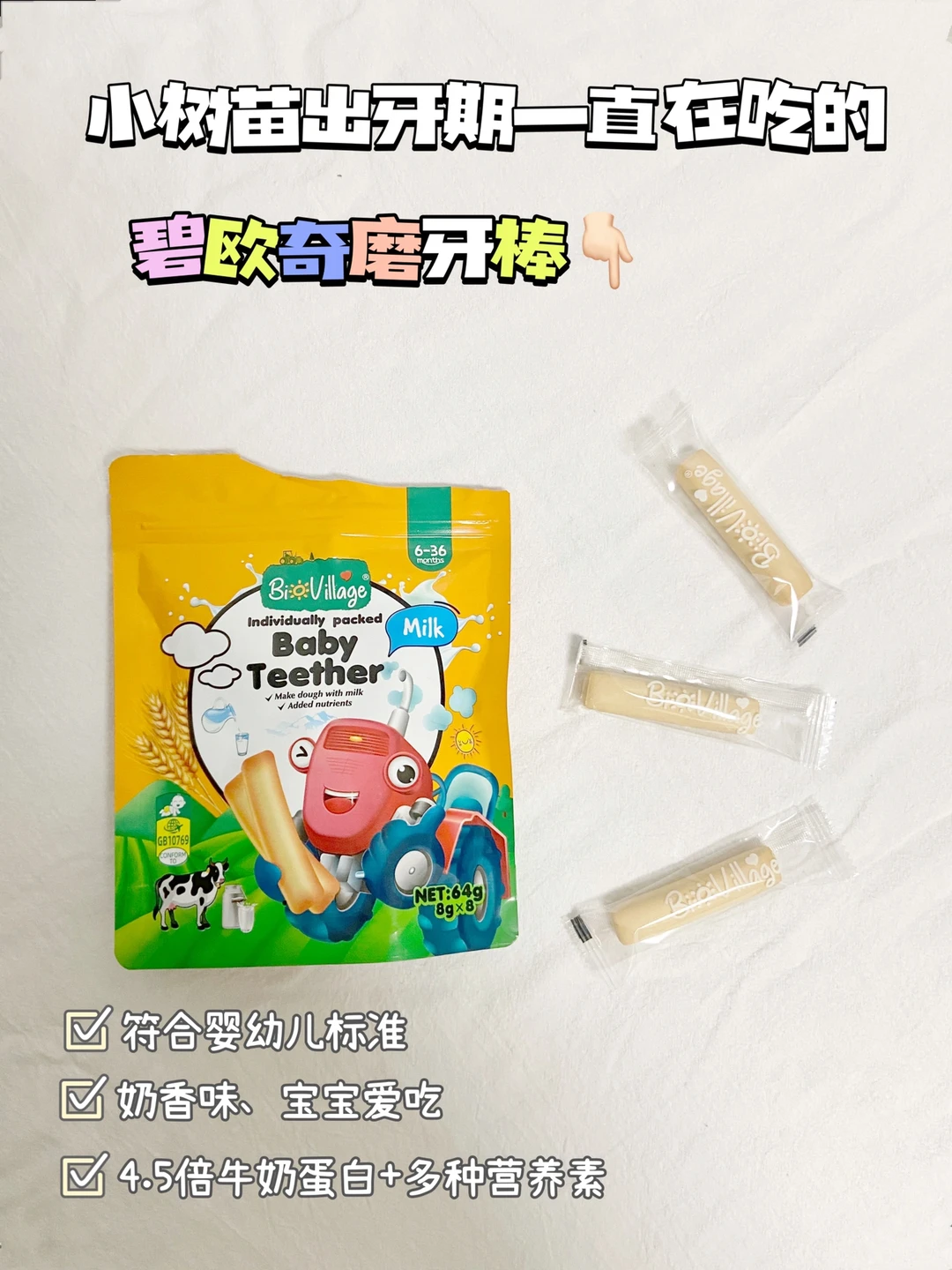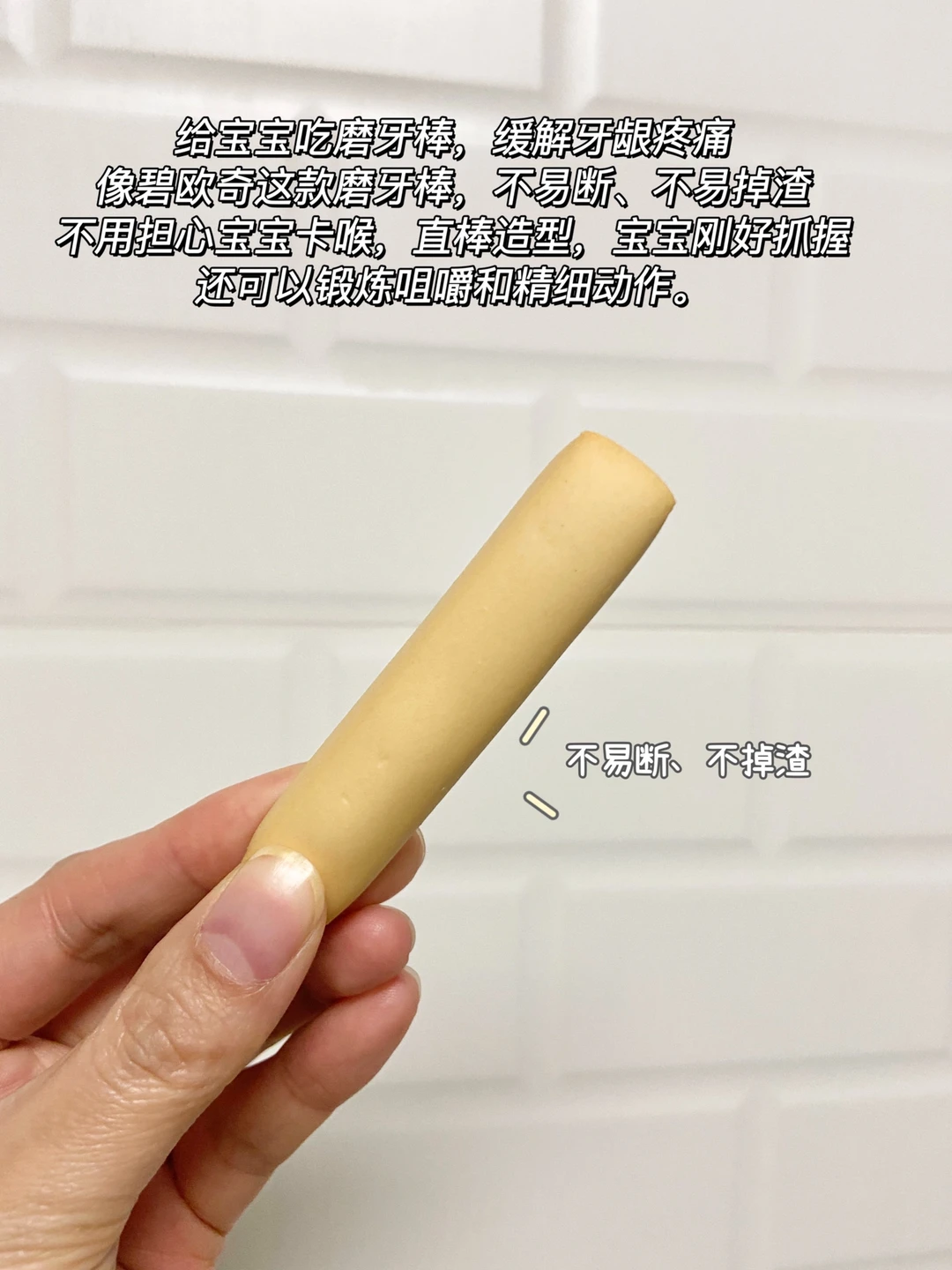 坚硬的磨牙棒可以让宝宝啃咬,转移注意力还能缓解牙龈肿胀带来的不适、帮助乳牙萌出。小树苗出牙的时候我给他买的碧欧奇的磨牙棒,它的质地非常紧实,宝宝长时间啃咬不容易断和掉渣,不用担心卡喉。符合婴幼儿标准,没有添加食盐、香精、色素、防腐剂,添加了多种营养元素,含4.5倍的牛奶蛋白,宝宝在磨牙啃咬的同时还能补充营养。