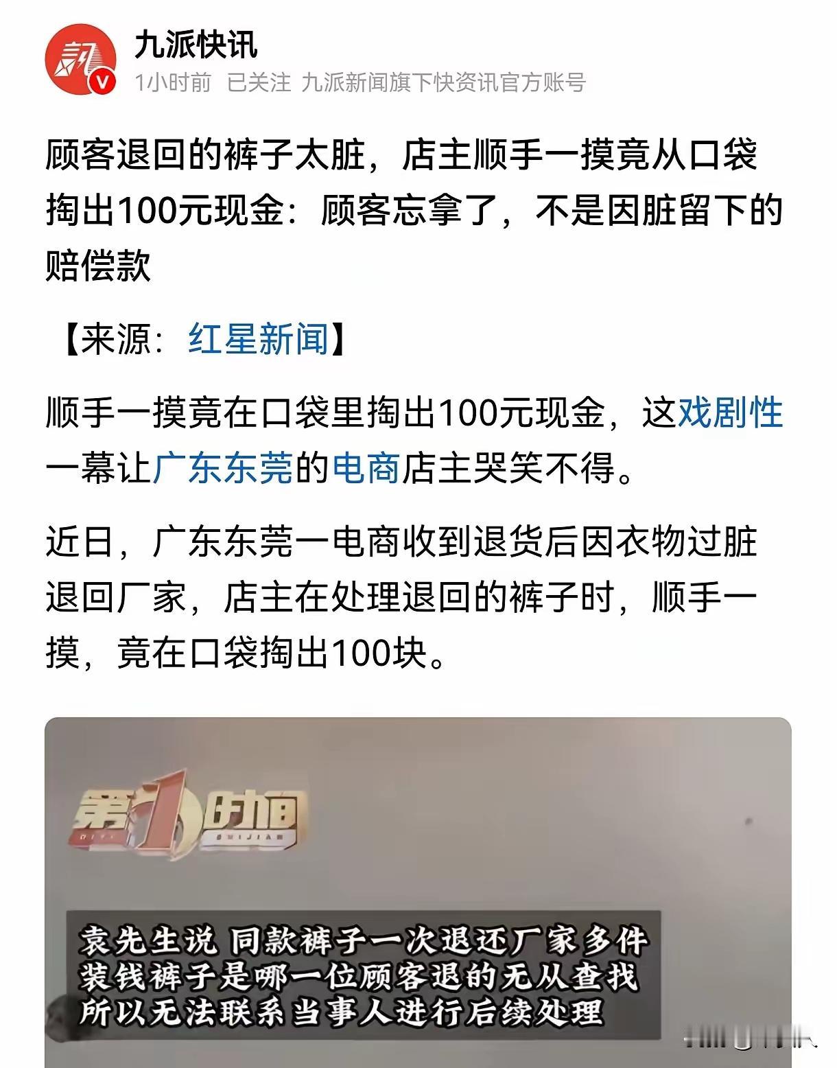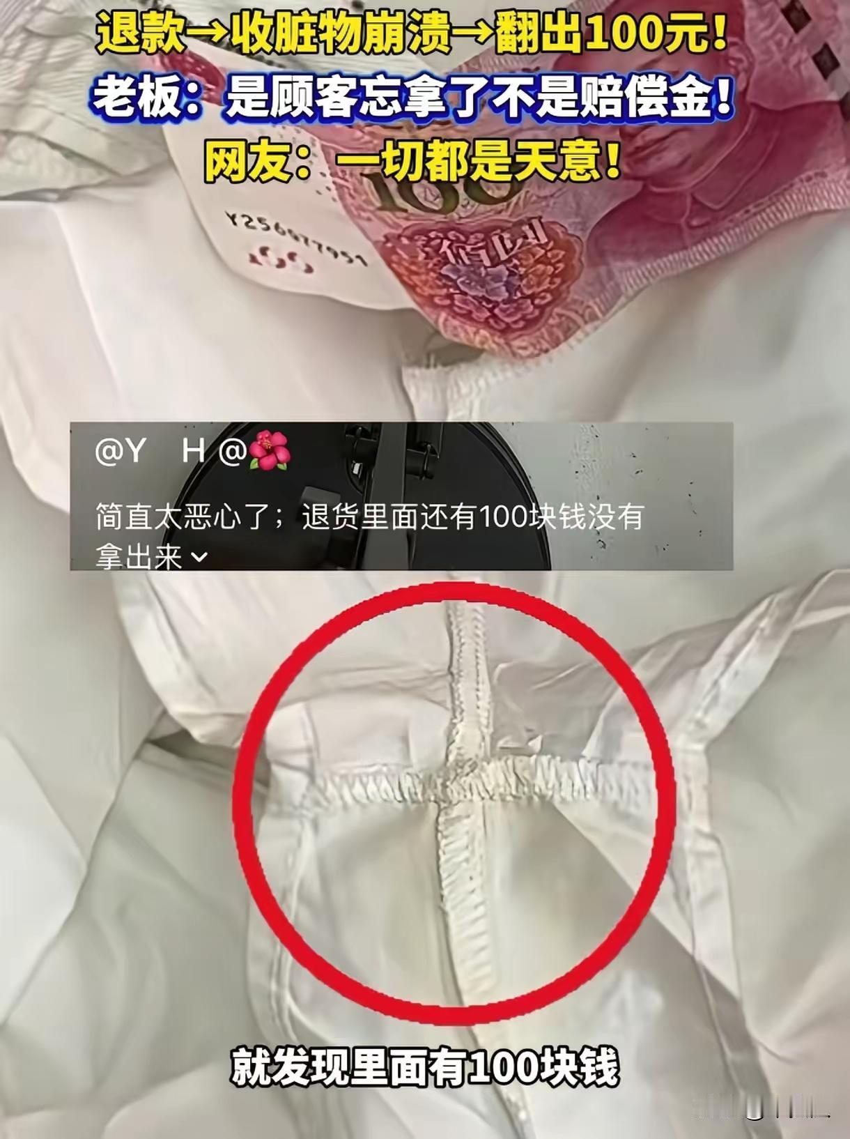 这就是天意!东莞店主退了70多块货款的裤子,被工厂打回才发现裤裆发黄明显被穿过,一摸口袋却掏出100块,这波操作真的又气又好笑!顾客穿脏裤子还敢退货,摆明了想占便宜,结果粗心把100块落口袋里,反倒让店主少亏了钱,这不是天意是什么?说白了这就是人品守恒,总想耍小聪明占小便宜,最后只会因小失大,偷鸡不成蚀把米。虽说按法律店主该把100块还回去,但顾客穿脏裤子退货的行为本就失了本分,哪怕店主扣下差价也合情合理。做人做事还是得守底线,别想着钻空子,不然看似占了便宜,实则丢了人品还可能吃大亏。你们觉得店主该把这100块还给这位顾客吗?