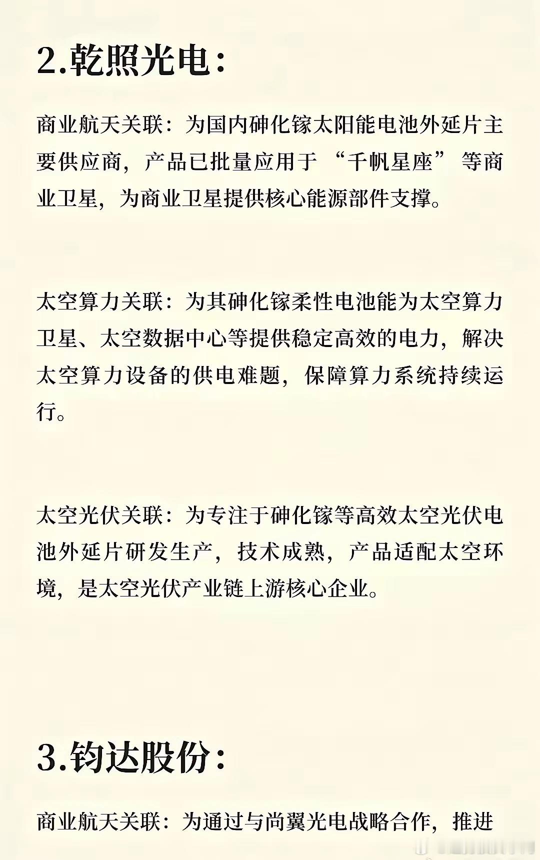 商业航天+太空算力+太空光伏 8家核心标的(精简版)1. 中国卫星:卫星制造龙头,低轨星座+卫星AI算力(提升10倍)+太空光伏能源,三赛道核心卡位2. 乾照光电:砷化镓光伏电池核心供应商,为商业卫星、太空算力设备供能,太空光伏上游龙头3. 钧达股份:与尚翼光电合作钙钛矿叠层电池在轨验证,太空光伏效率超地面7-10倍,赋能太空算力4. 晶科能源:钙钛矿-晶硅叠层技术适配卫星供电,聚焦“AI+太空光伏”,为太空算力提供高效能源