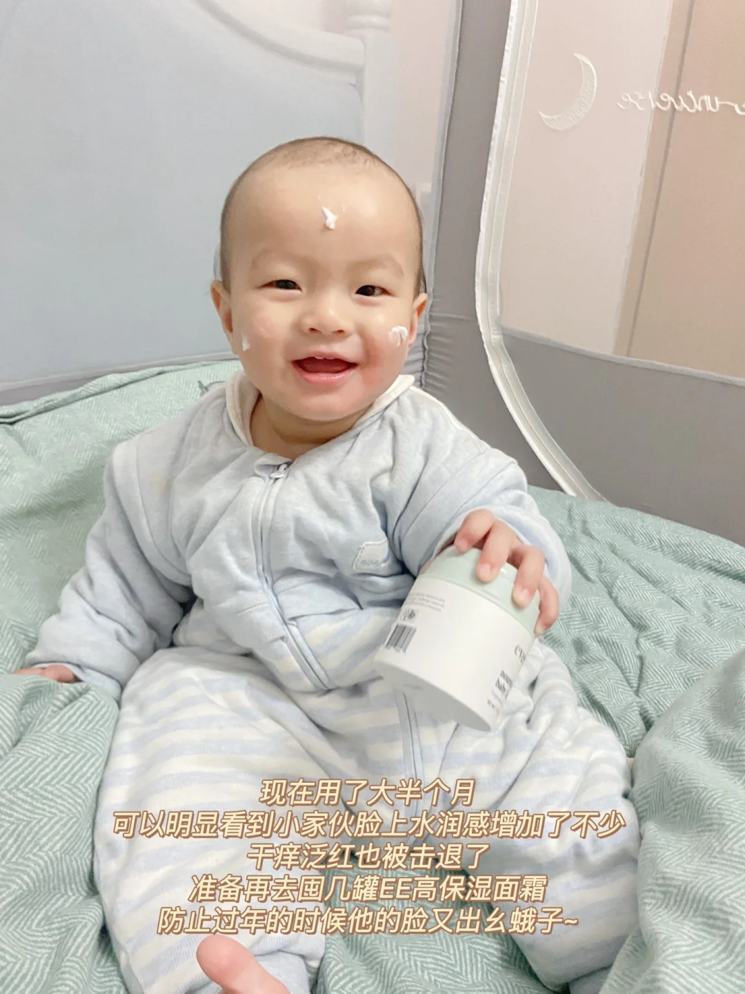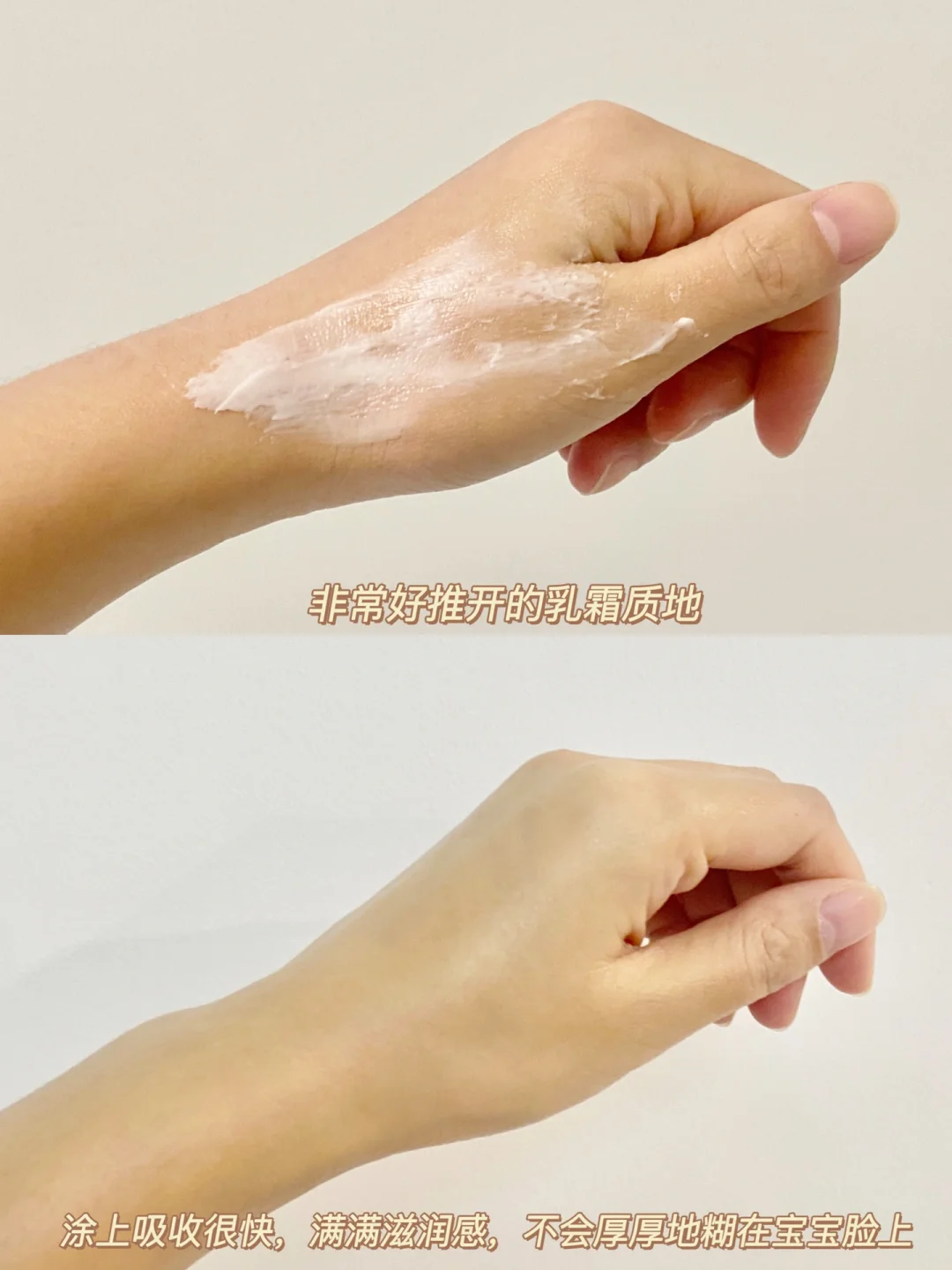 质地是乳霜状、有点偏厚但很好推开,吸收也快、不会浮在脸上黏糊糊。有了它,我家宝宝整个秋冬小脸蛋都没干燥起皮过~