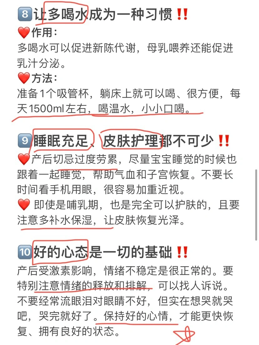 产后切忌过度劳累,尽量宝宝睡觉的时候也跟着一起睡觉,帮助气血和子宫恢复。即使是哺乳期,也是完全可以护肤的,且要注意多补水保湿,让皮肤恢复光泽。