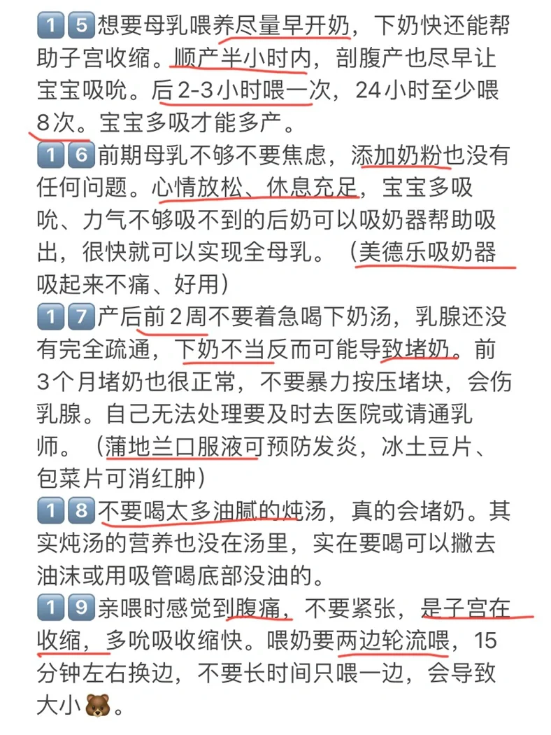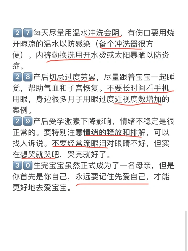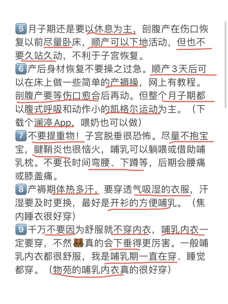 5️⃣月子期还是要以休息为主,剖腹产在伤口恢复以前尽量卧床,顺产可以下地活动,但也不要久站久动,不利于子宫恢复。