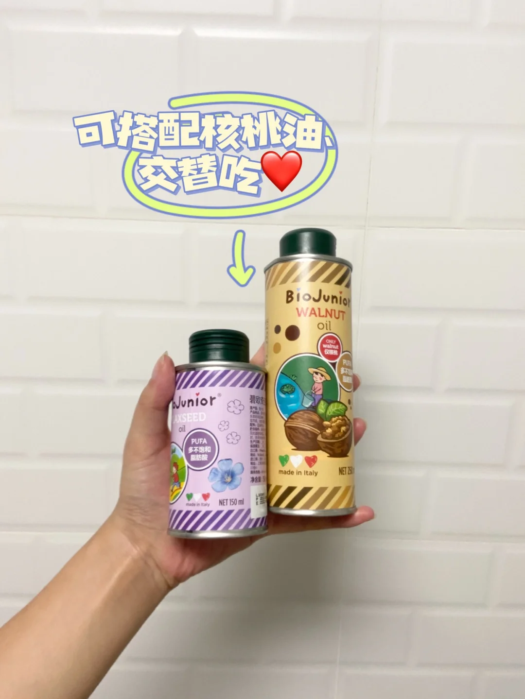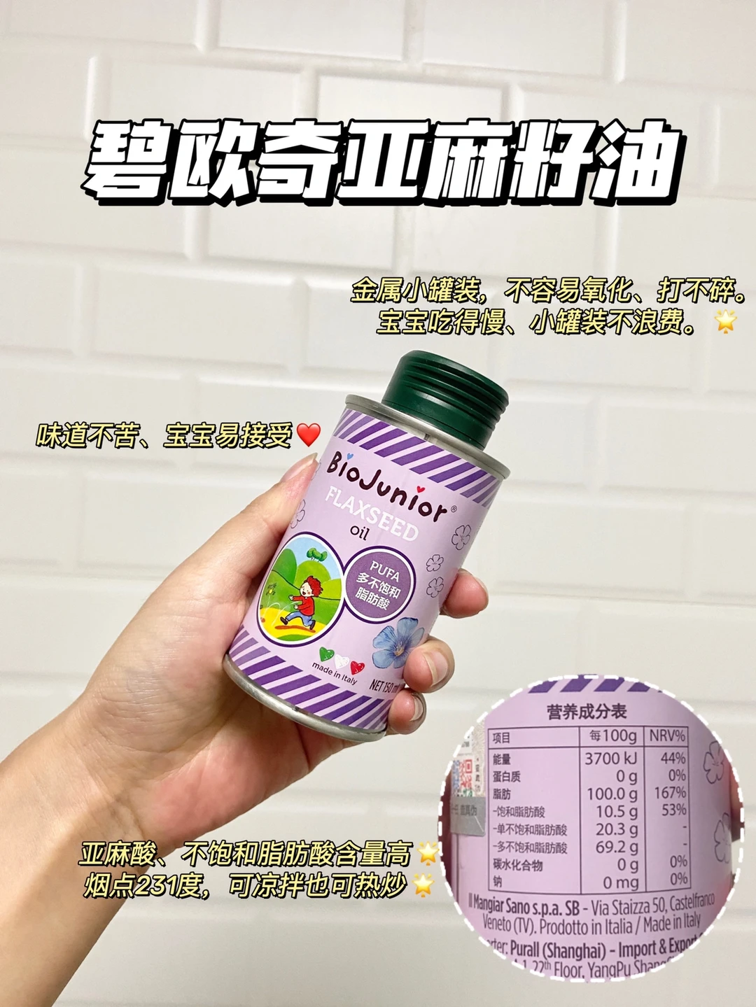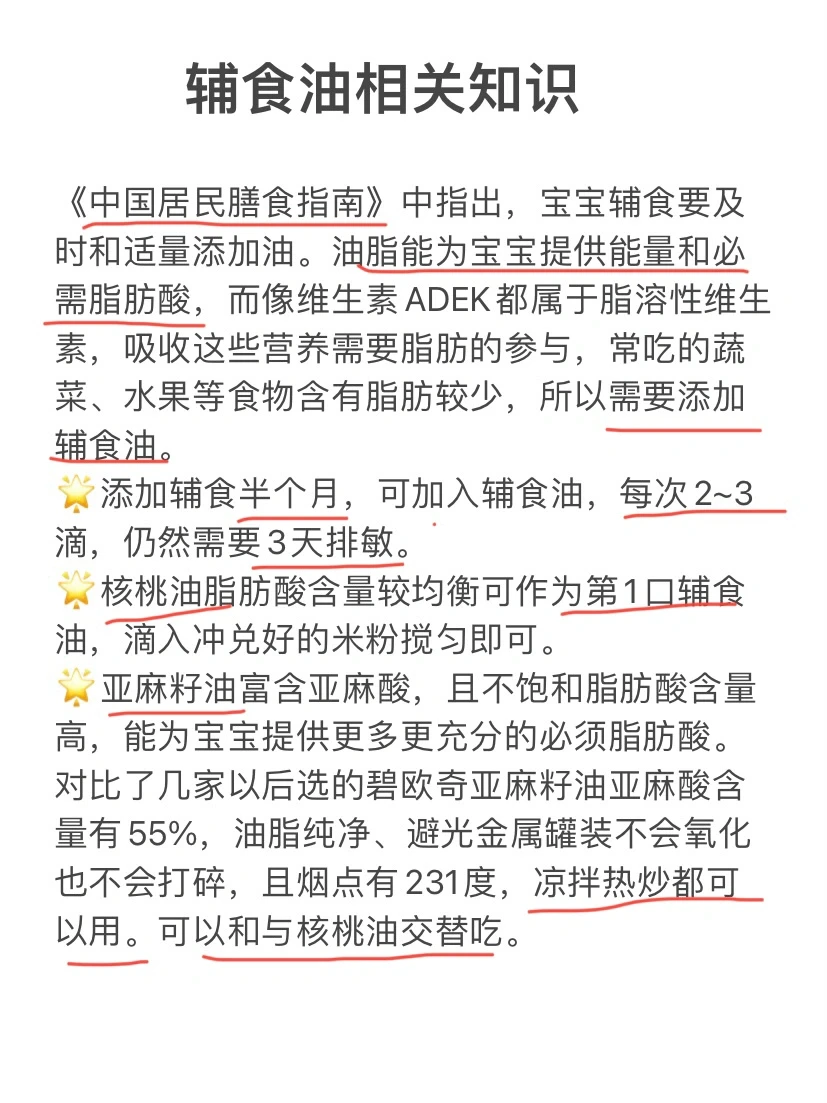 ⭕️宝宝辅食要及时和适量添加油,油脂能为宝宝提供能量和必需脂肪酸,添加辅食半个月,可加入辅食油,每次2~3滴,仍然需要3天排敏。核桃油脂肪酸含量较均衡可作为第1口辅食油,滴入冲兑好的米粉搅匀即可。亚麻籽油富含亚麻酸,能为宝宝提供更多更充分的必须脂肪酸。对比了几家以后选的碧欧奇亚麻籽油,亚麻酸含量有55%,油脂纯净、避光金属罐装不会氧化也不会打碎,且烟点有231度,凉拌热炒都可以用。可以和与核桃油交替吃。