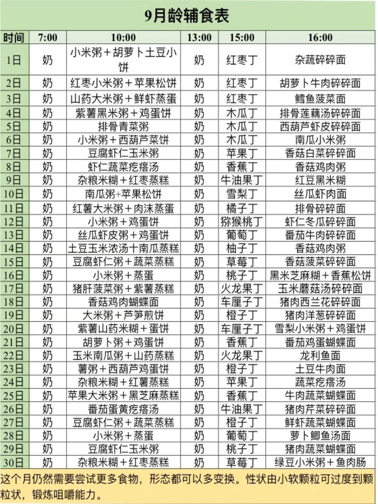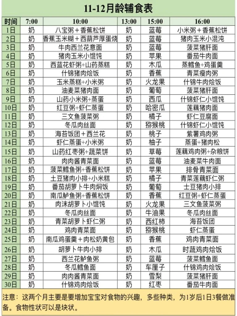 这个阶段主要是扩大食物种类,增加进食兴趣,为1岁后1日3餐做准备,由粥面蔬菜肉类到米饭都可以,性状是小软的碎块。