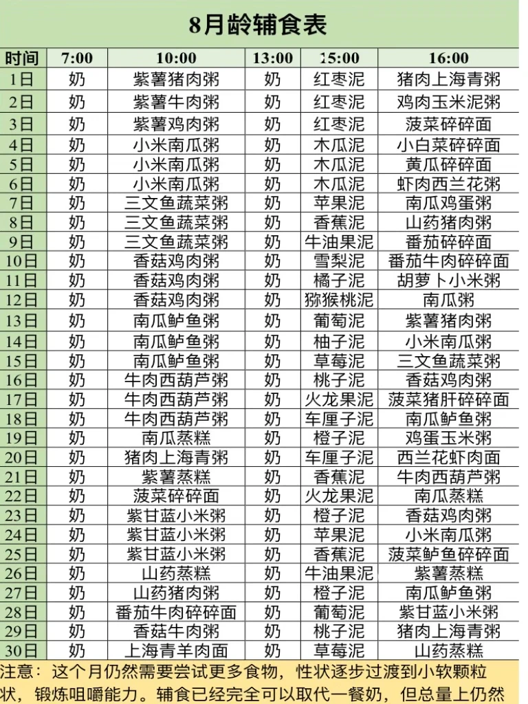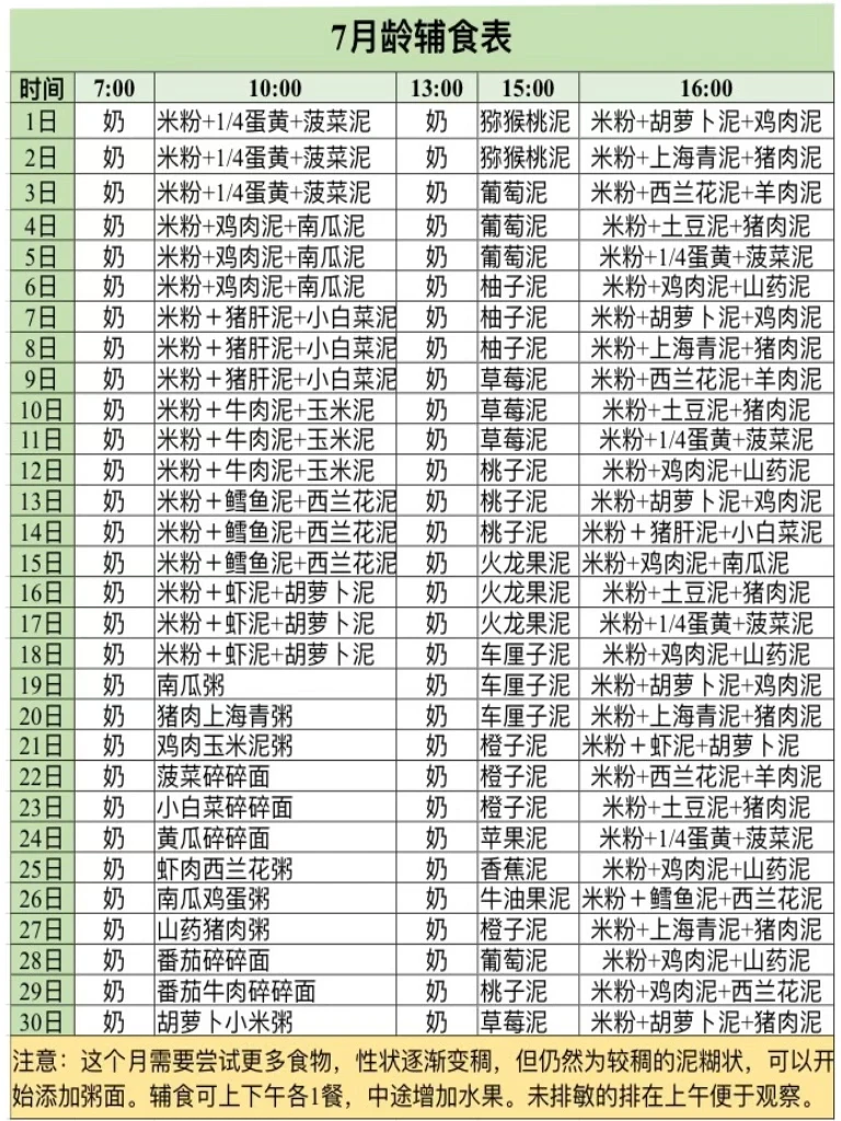 ⭕️第1口从高铁米粉开始,7天后依次开始加菜泥、肉泥、果泥等,为满足宝宝补铁的需求,尽早加肉,食物种类越丰富越好。由简单1种到逐渐多种混合。