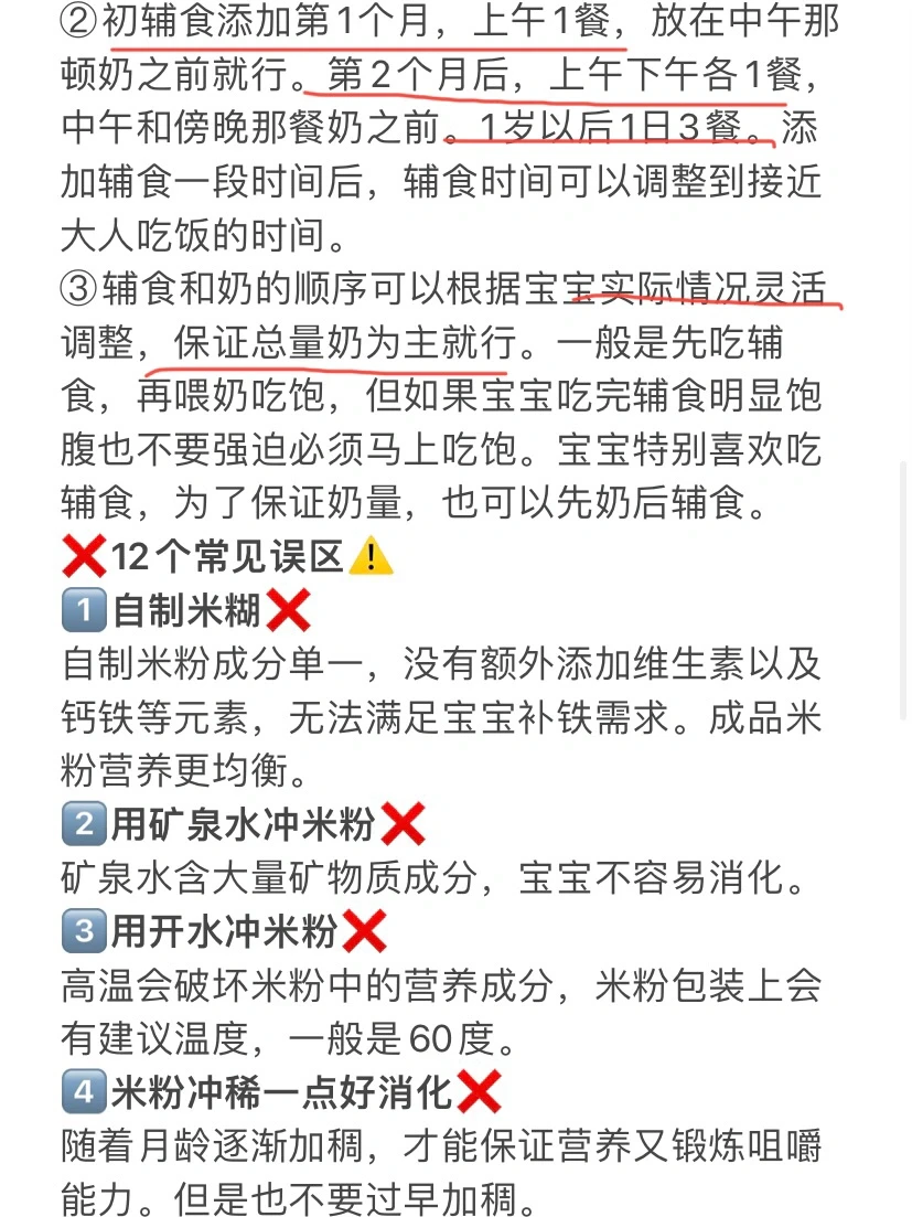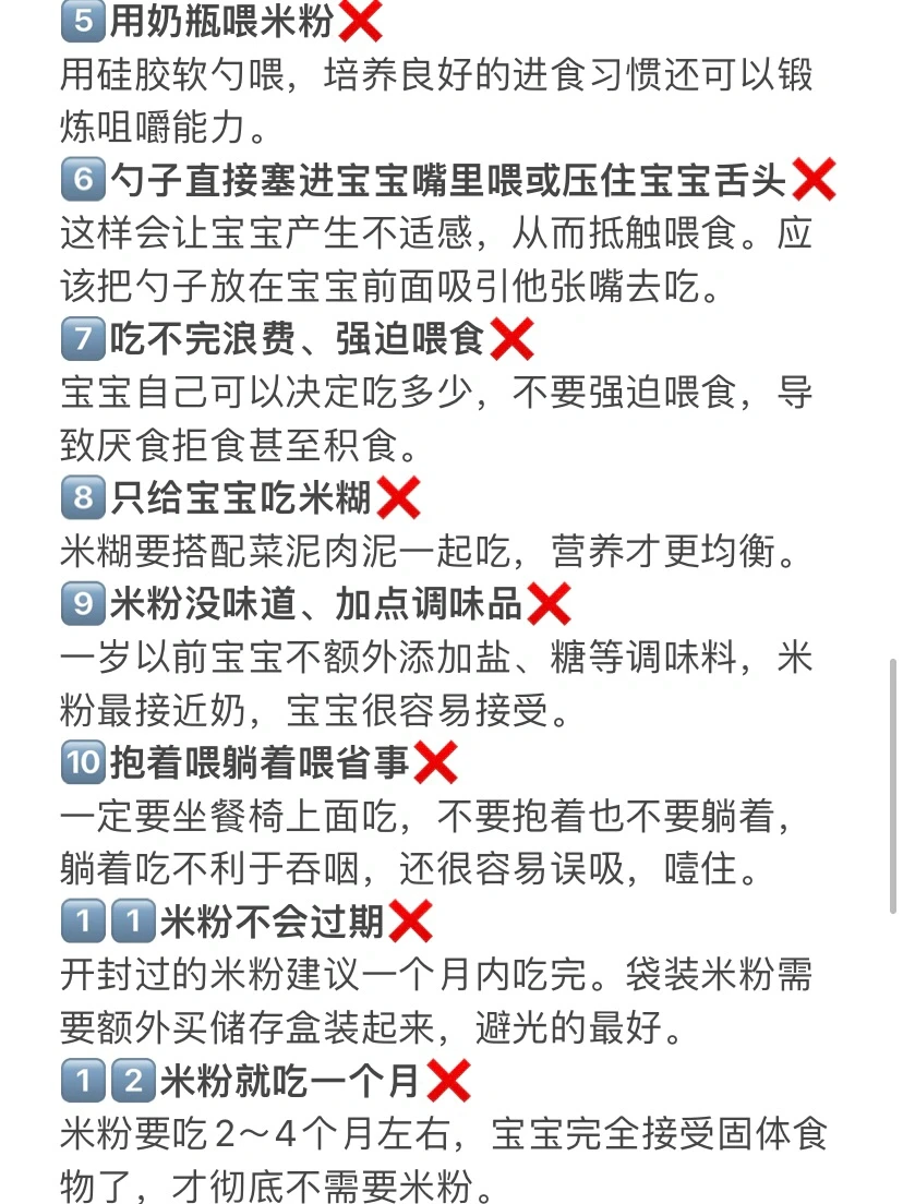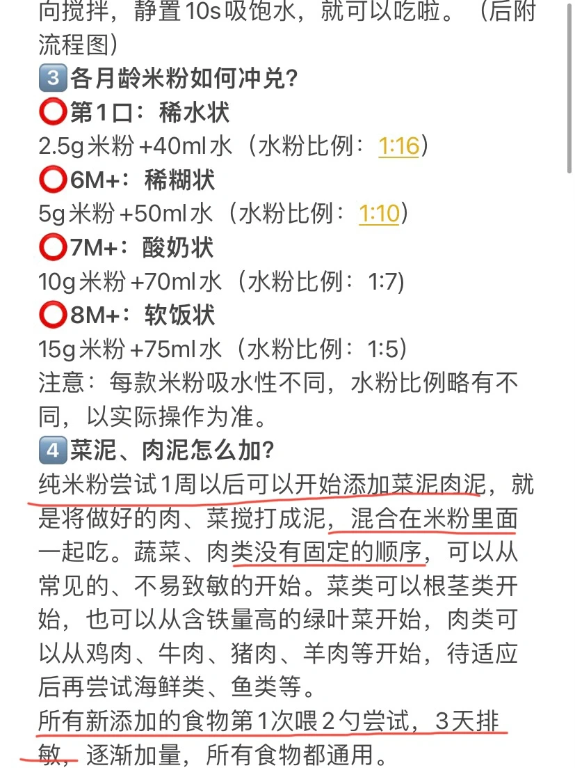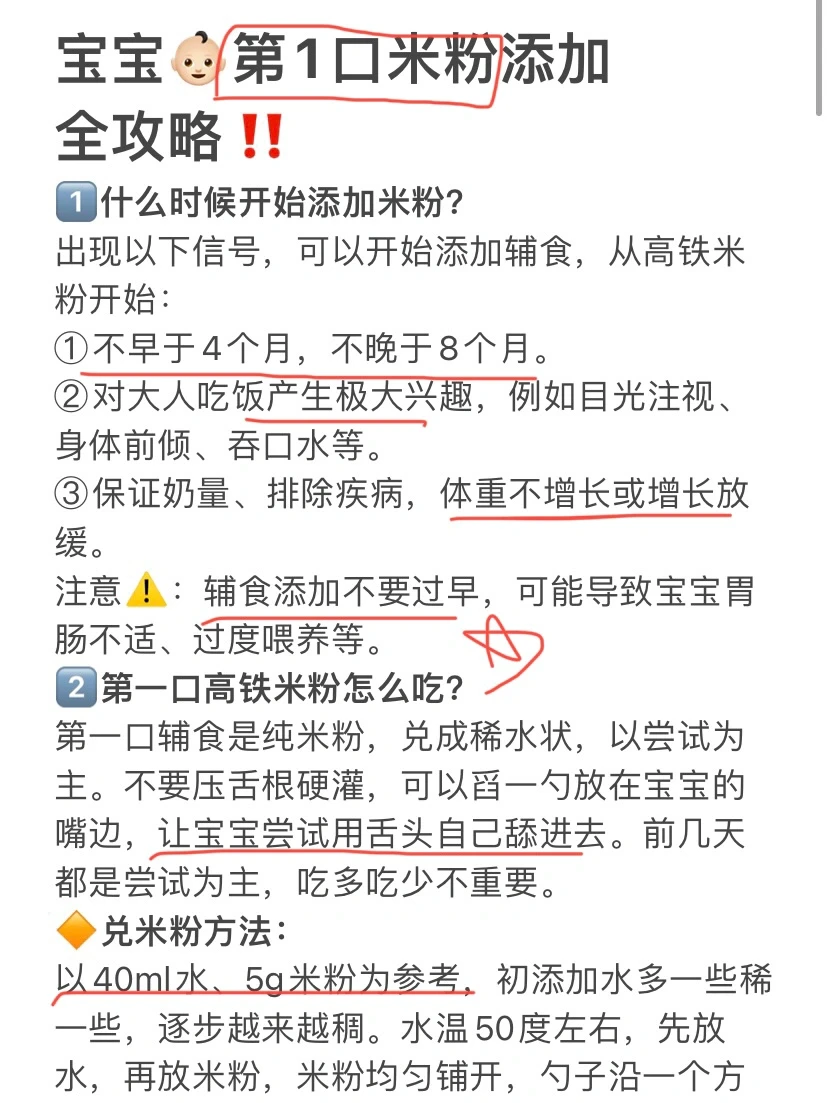 第①口辅食是原味米粉,兑成稀水状,以尝试为主。不要压舌根硬灌,可以舀一勺放在宝宝的嘴边,让宝宝尝试自己舔进去。前3天都是尝试为主,吃多吃少不重要。