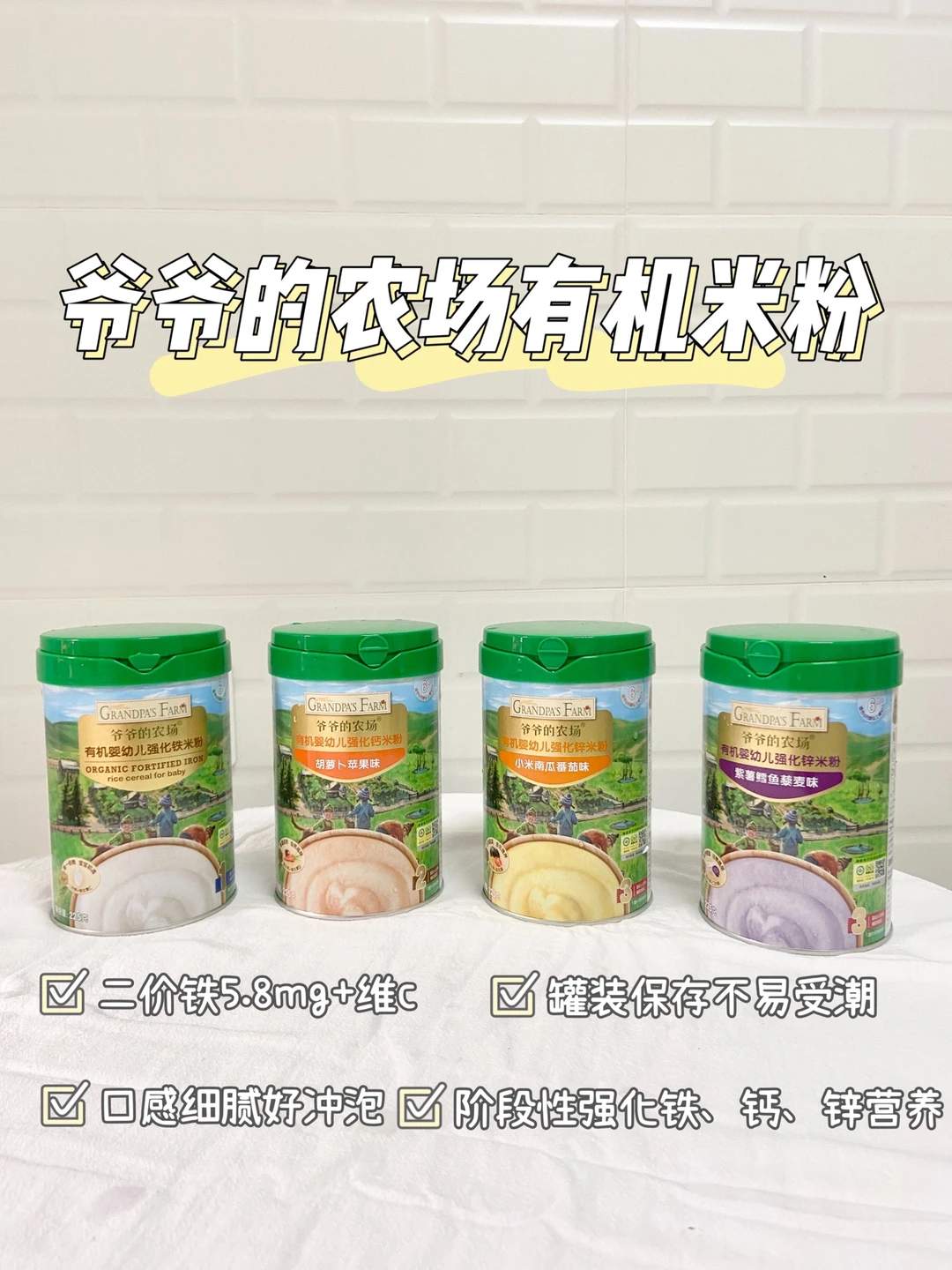 我给小树苗选的“爷爷的农场有机米粉”,二价铁搭配维C,铁含量高达5.8mg,配料表是真的干干净净,有大米、钙、铁、锌、维生素A、D、B1、C等,且没有额外添加糖、香精等。原料是有机大米,不容易过敏,很好冲泡,口感也很细腻,还是密封罐包装,很好保存。