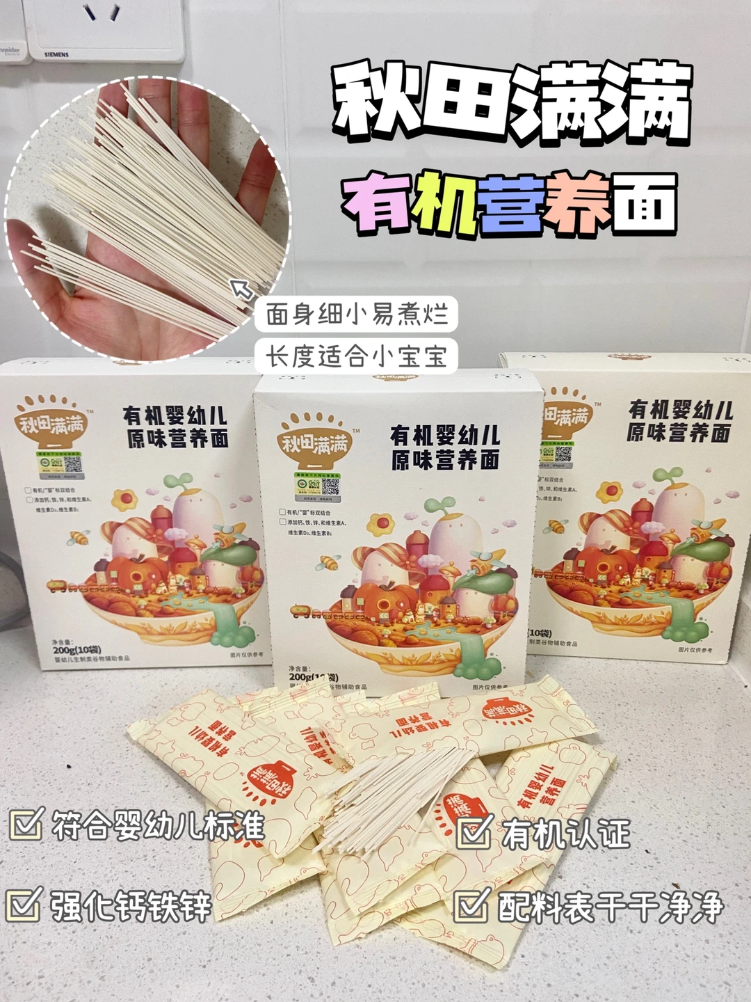 从小树苗7个月开始就一直在回gou的秋田满满有机营养面,它是符合婴幼儿标准还通过了有机认证,配料表也是干干净净,很放心给宝宝吃。此外,还强化了钙铁锌等营养素,营养更丰富。一大盒里面有很多小袋,都是独立包装的,刚开始1次半包,8个半月后就可以吃到1包。面条很细,容易煮软不会糊汤,宝宝能锻炼咀嚼还好吞咽。刚开始添加面条时可以把面条捏碎,看宝宝适应程度,逐渐变长。