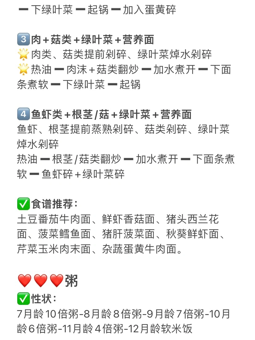 根据宝宝的发育情况,例如宝宝本身对辅食接受度高、消化较好,就可以从上一阶段较稠的泥糊状食物过渡到细小有颗粒感的食物,例如营养面、粥等。原本辅食机打碎的食物可以用刀剁碎,保持颗粒感,先从细小的颗粒逐渐变大。还可以给宝宝提供小块一捏即烂的