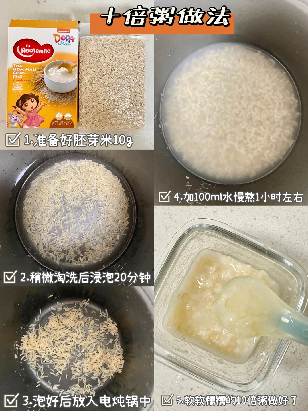 辅食粥从10倍粥开始,逐渐变稠,给宝宝做辅食粥可以用胚芽米,比精白米更有营养,比糙米口感更好。煮好后口感软软糯糯的,可以锻炼宝宝咀嚼能力、也好消化。
