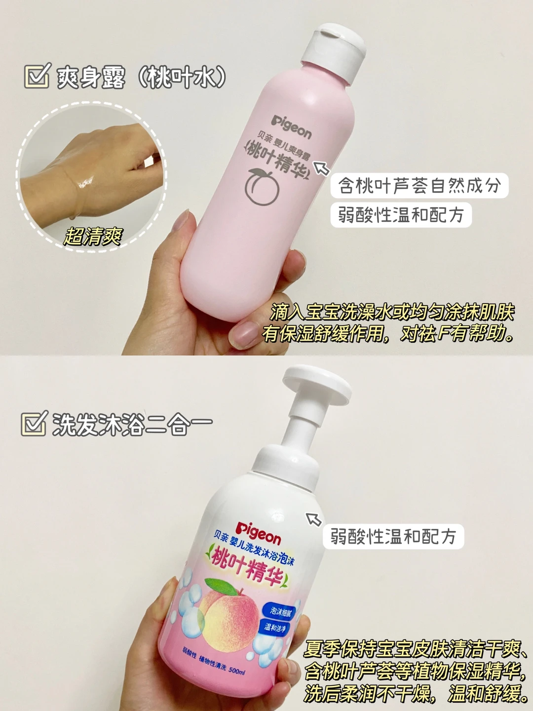 选择好的洗护产品真的很重要,夏季出生宝宝尤其会受到热疹(痱子)困扰,平时除了保持环境凉爽,选择透气、轻薄的衣物外,自用很有用的桃子水是真的需要人手一瓶成分简单,蕴含桃叶、芦荟自然成分,保湿的同时又能舒缓肌肤泛红,凝露质地好吸收,涂上像是做水疗一样舒服搭配同系列的桃叶洗护二合一,夏日清爽cp就安排上了泡沫绵密好冲洗,弱酸性温和配方,新生儿可以放心使用,洗完皮肤柔润不会干燥。