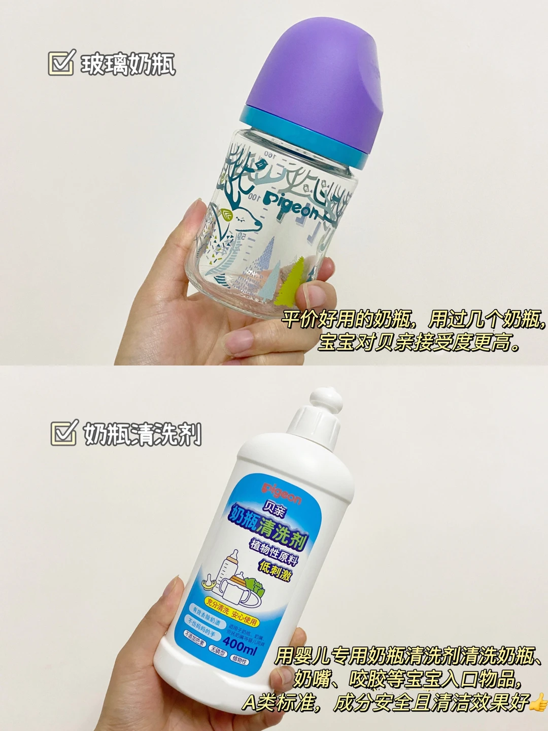 无论是哪种喂养方式都要先备好一个奶瓶,用过几款下来觉得贝亲的玻璃奶瓶是真的平价又好用,奶嘴柔韧且孔径、流量符合对应月龄宝宝的吮吸需求,宝宝接受度高。配上他家的奶瓶清洗剂,A类标准,植物性原料、入口安全,清洁效果很好。