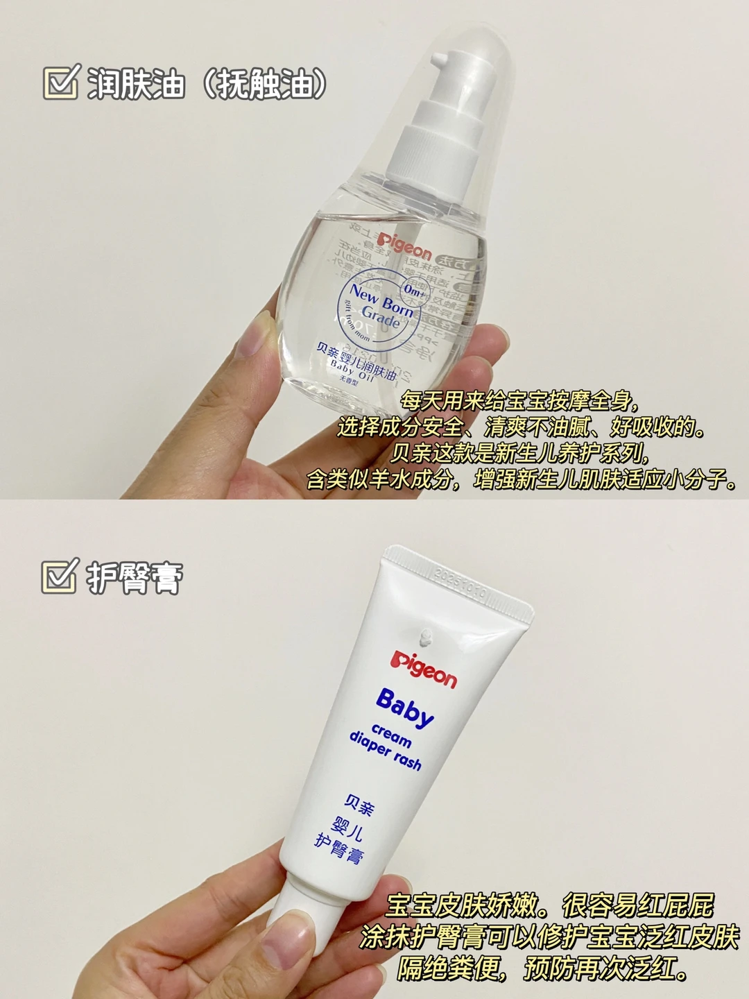 此外还要准备好润肤油,每天用来给宝宝按摩全身。选择成分安全、清爽不油腻、好吸收的。贝亲这款是新生儿养护系列,含类似羊水成分,增强新生儿肌肤适应小分子。相对来说会比较清爽,不黏糊,而且性价比很高,怎么用都不心疼。皮肤娇嫩容易红屁屁的宝宝,使用护臀膏可以修复皮肤、隔离粪便预防再次泛红,选择时要注意选择不含激素、好推开不厚重的。