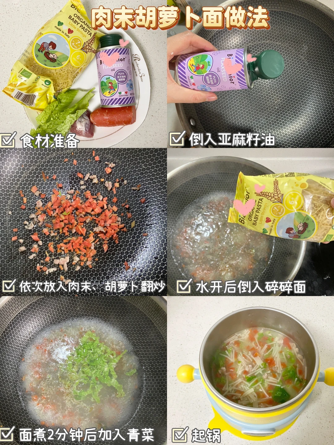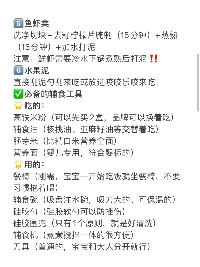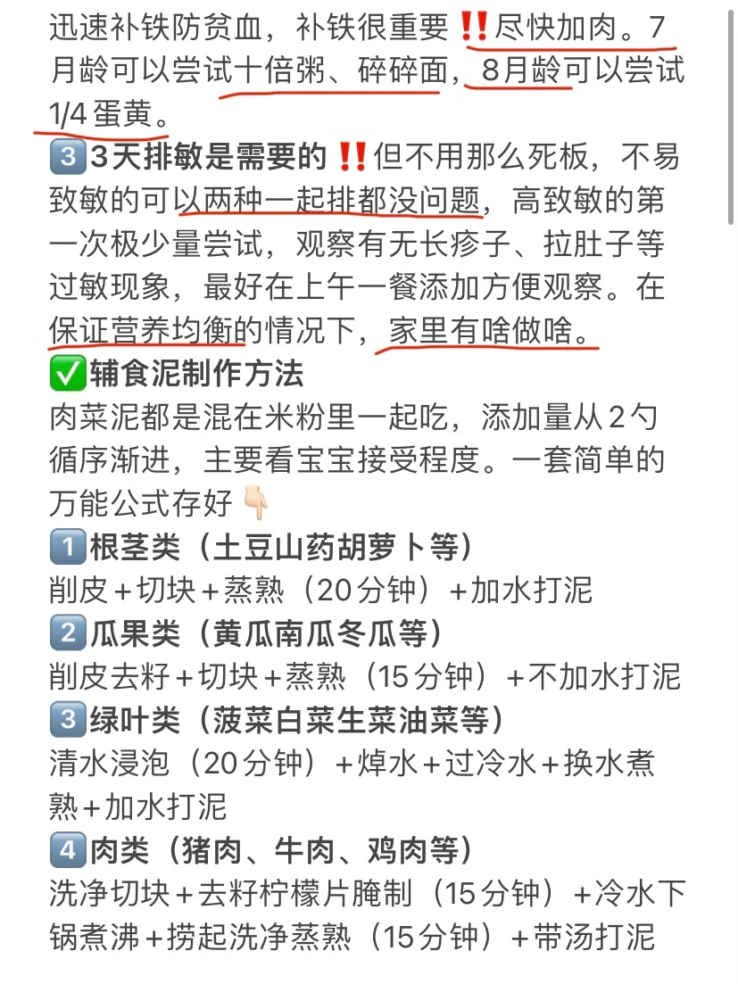 2️⃣第1口肯定是高铁米粉,7天后肉菜打成泥混在米粉里一起吃、尽快加肉。7月龄可以尝试十倍粥、碎碎面,8月龄可以尝试1/4蛋黄。