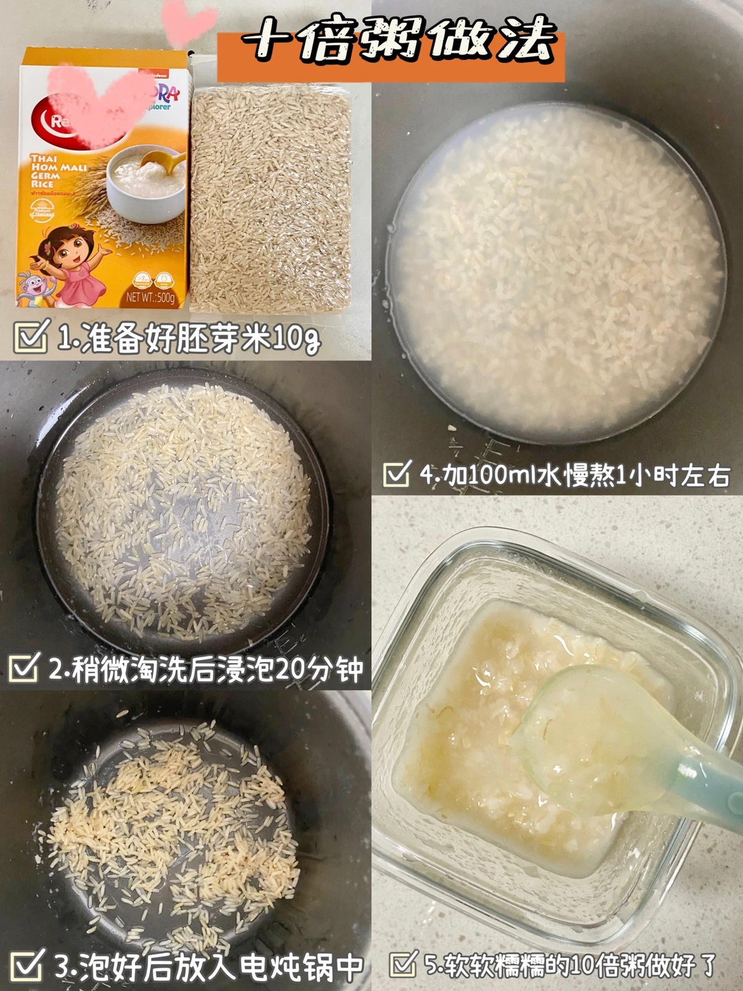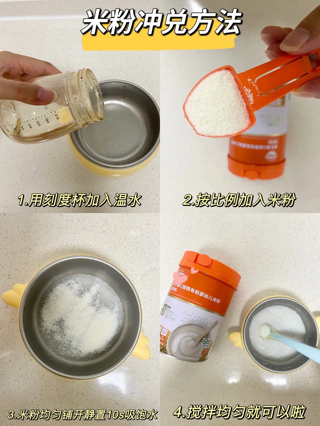 🌟 冲兑米粉以5g米粉➕40ml温水(60度左右)为参考,初期米粉少一点、后期米粉多一点,观察稀稠自行调节。先倒水、米粉均匀铺开、静置10s、搅拌即可。