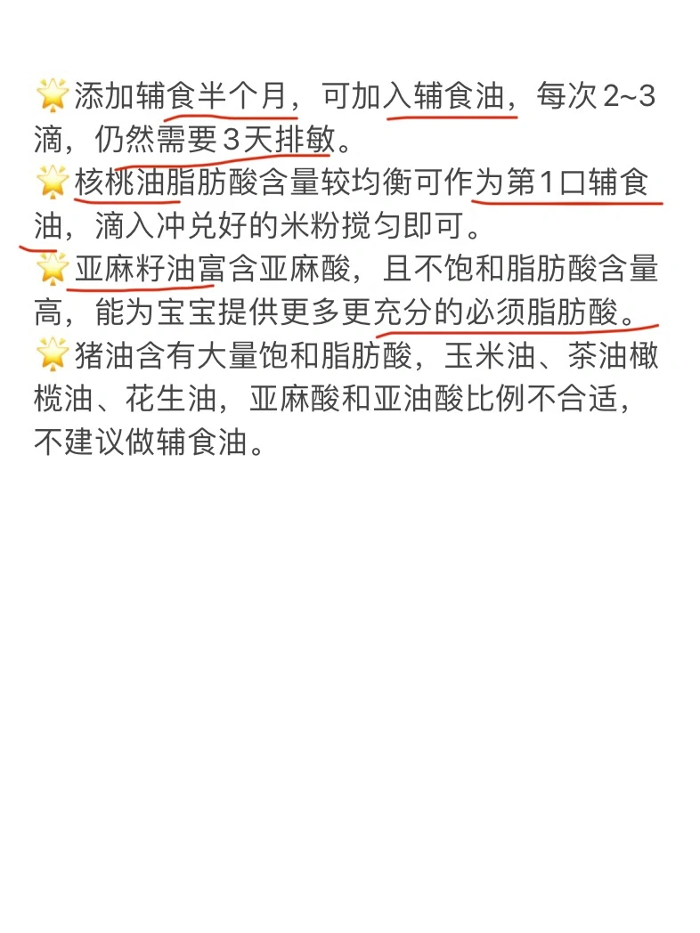 🌟添加辅食半个月,可加入辅食油,每次2~3滴,仍然需要3天排敏。