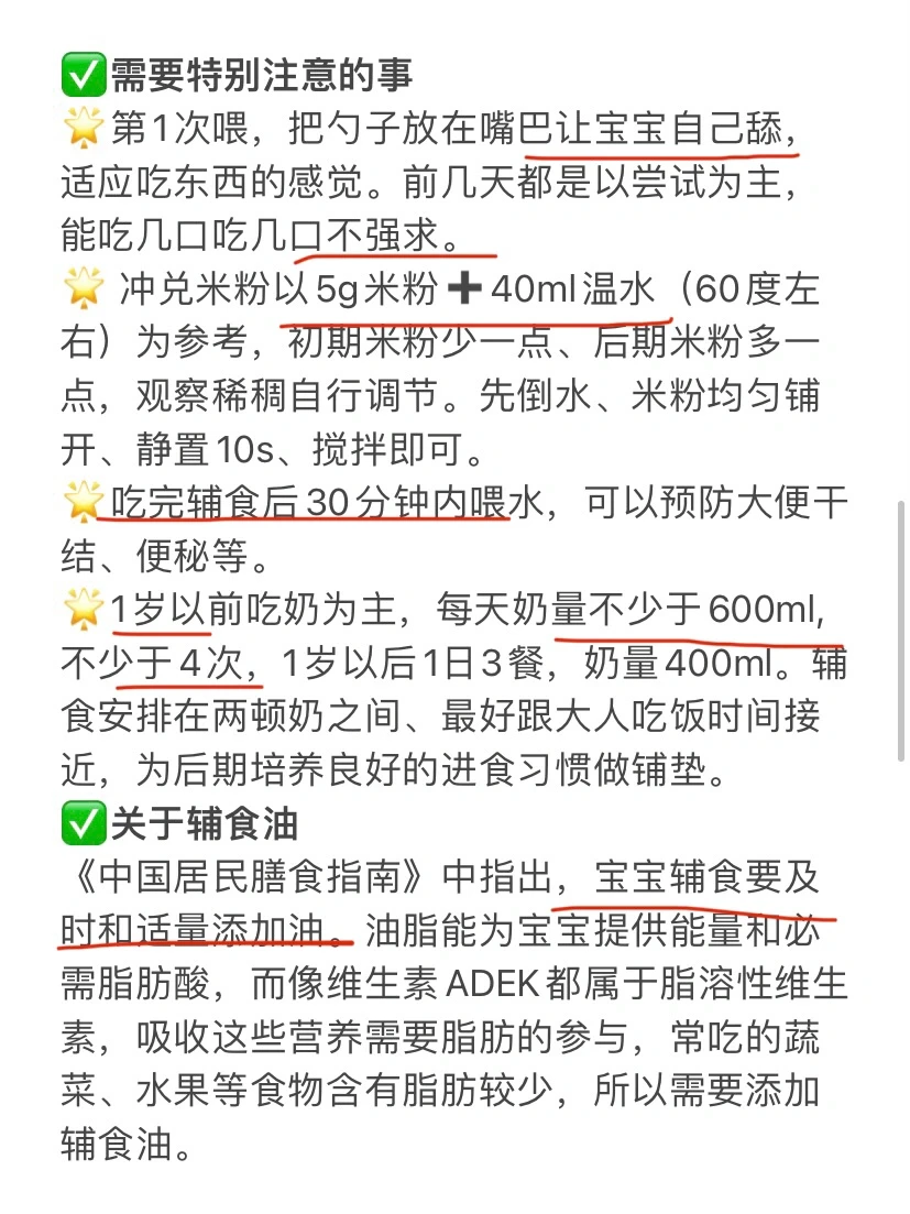 🌟1岁以前吃奶为主,每天奶量不少于600ml,不少于4次,1岁以后1日3餐,奶量400ml。辅食安排在两顿奶之间、最好跟大人吃饭时间接近,为后期培养良好的进食习惯做铺垫。