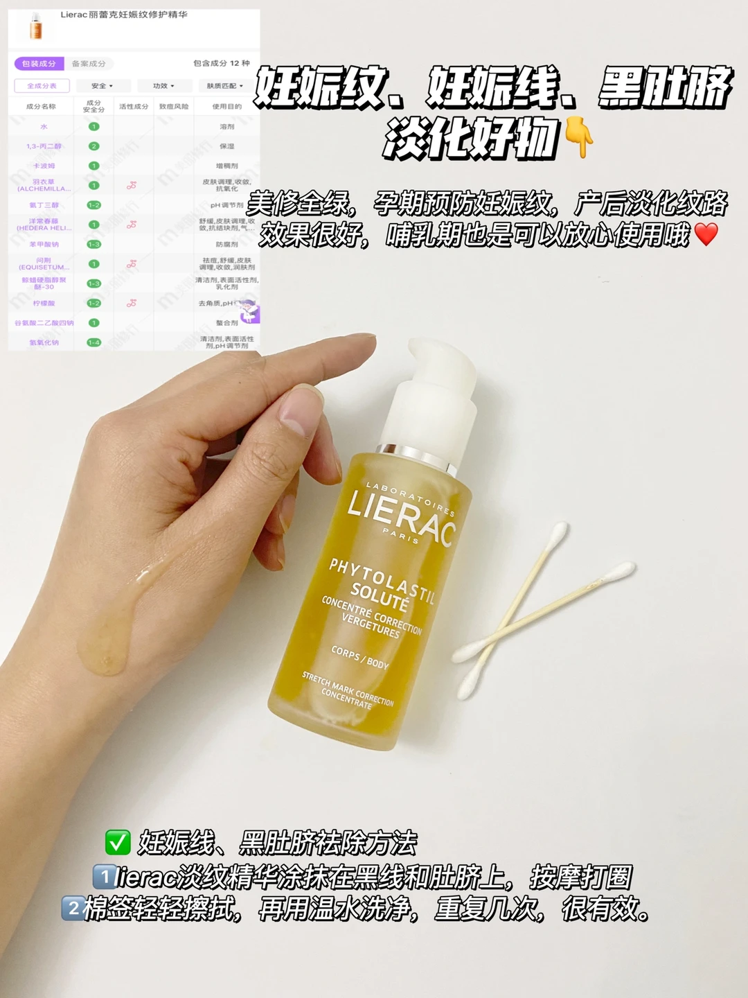 从孕期就一直在用的lierac丽蕾克淡纹精华,它是法国的实验室研究出的砖业淡纹产品,质地像面部用的精华一推开就吸收进皮肤里,不像油和霜那么黏腻,用完之后很清爽,不会粘衣服。产后我去妊娠线和黑肚脐也用的这个,方法干货里面很有讲。长了为数不多的几根妊娠纹,还有颈纹,我也用的这个,坚持涂真的有淡化效果,分享给所有产后想要变瘦变美的姐妹。
