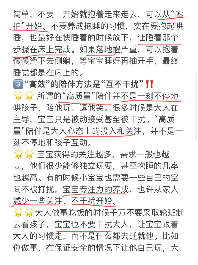 “高质量”陪伴并不是一刻不停地哄孩子,陪他玩、逗他笑。很多时候是大人在主导,宝宝只是被动接受甚至被干扰。“高质量”陪伴是大人心态上的投入和关注,并不是一刻不停地和孩子互动。宝宝有时间观察、思考,大人也能够完成自己的事。