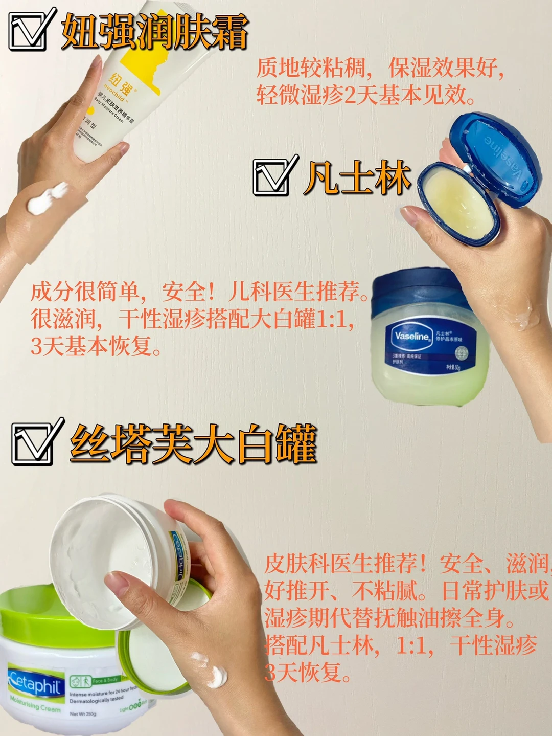 🌟凡士林:成分简单、医生推荐!滋润度很好,对宝宝干性湿疹很有效,搭配润肤霜使用效果更佳。