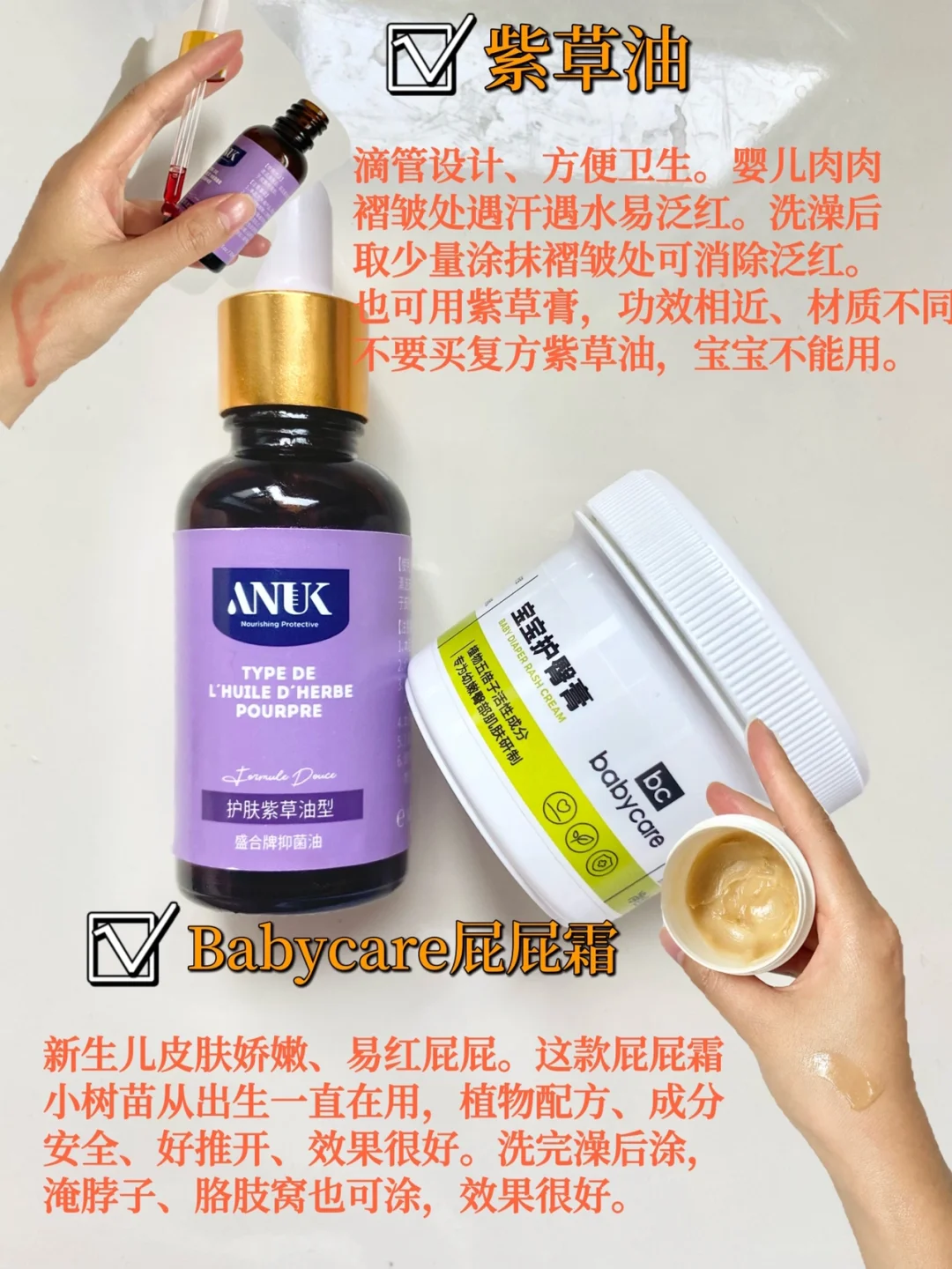 🌟紫草油:洗澡后涂抹于宝宝易出汗的皮肤褶皱处,对肌肤泛红较有效。