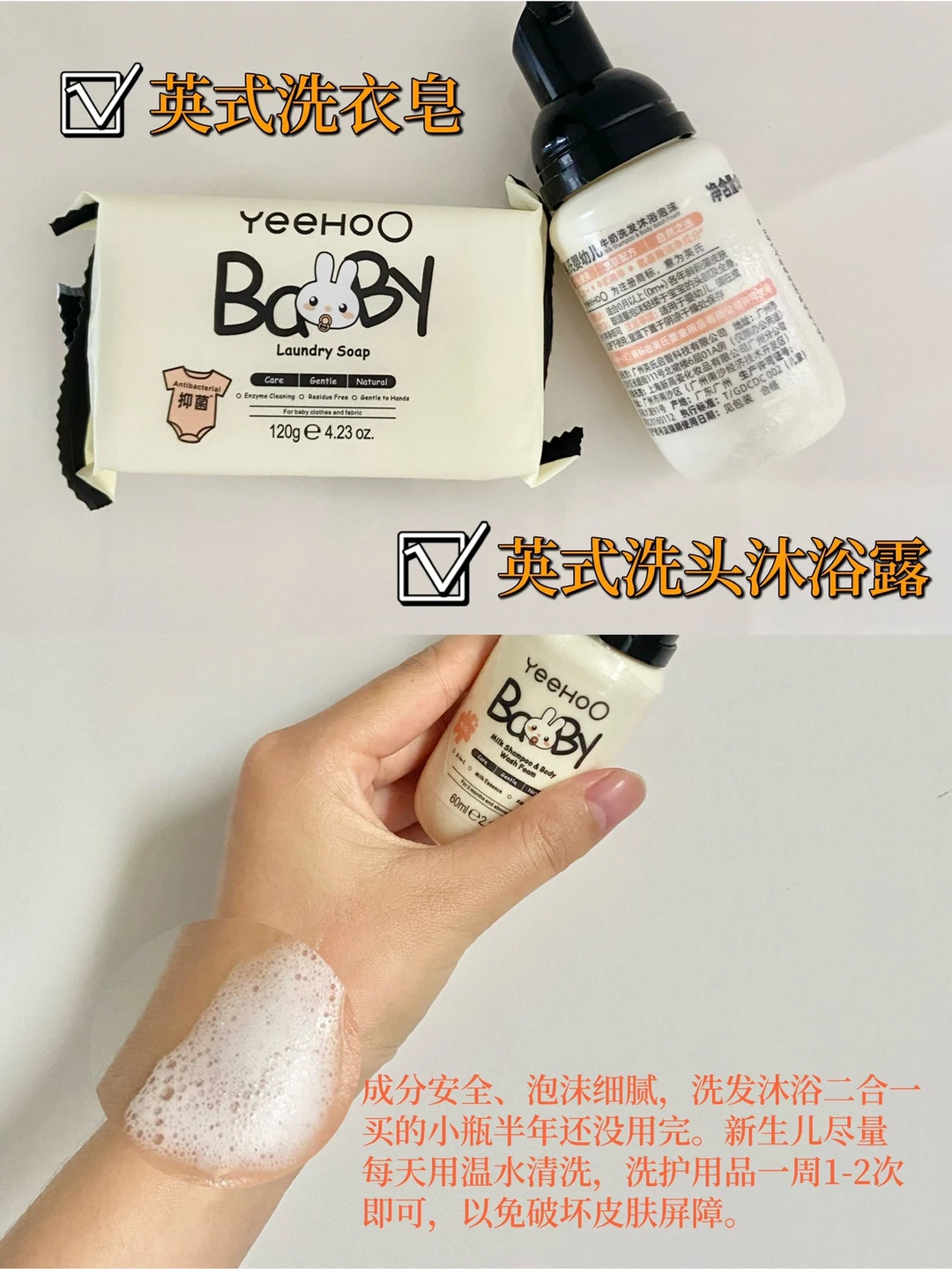 🌟洗头沐浴露:注意成分温和。1周使用1-2次,其余用温水清洗,1天1次,1次10分钟左右即可。过分清洁会破坏宝宝皮肤屏障。