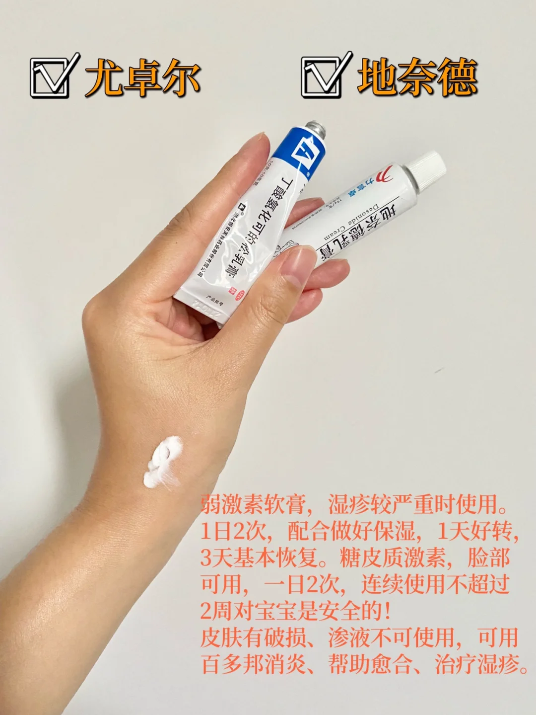 🌟地奈德:弱ji素软膏,对宝宝严重湿疹有效,1天2次,连续使用2周以内安全。