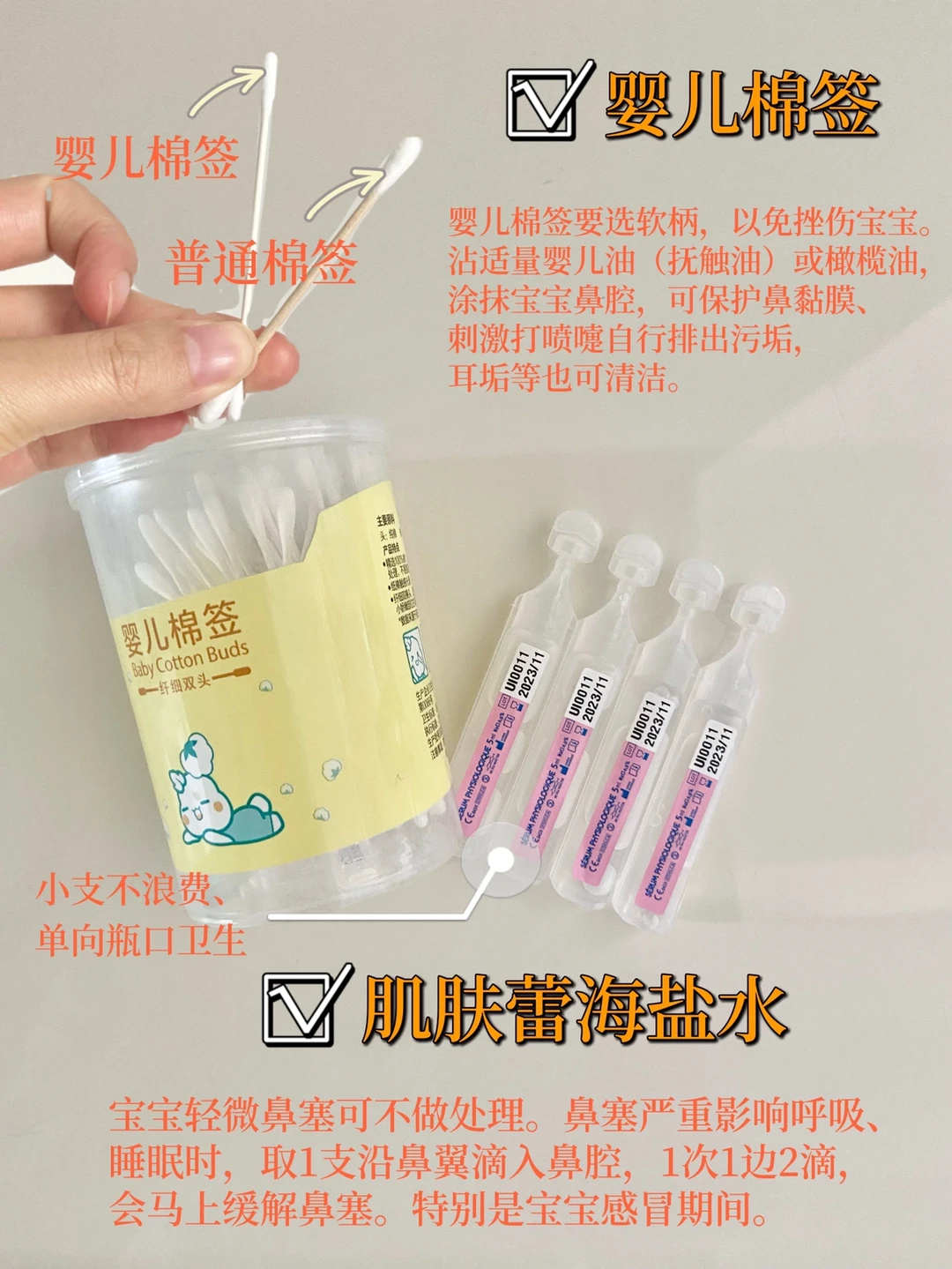 🌟婴儿棉签:要选细的、中间软柄、婴儿专用的。鼻腔耳垢等清理都需要用到。