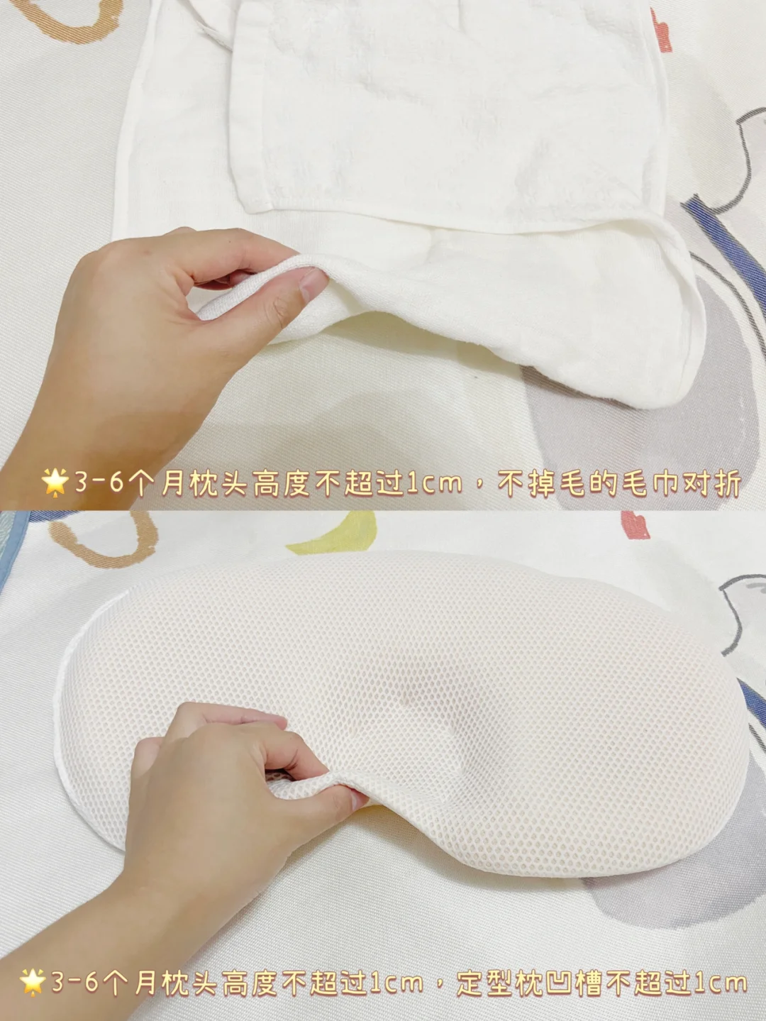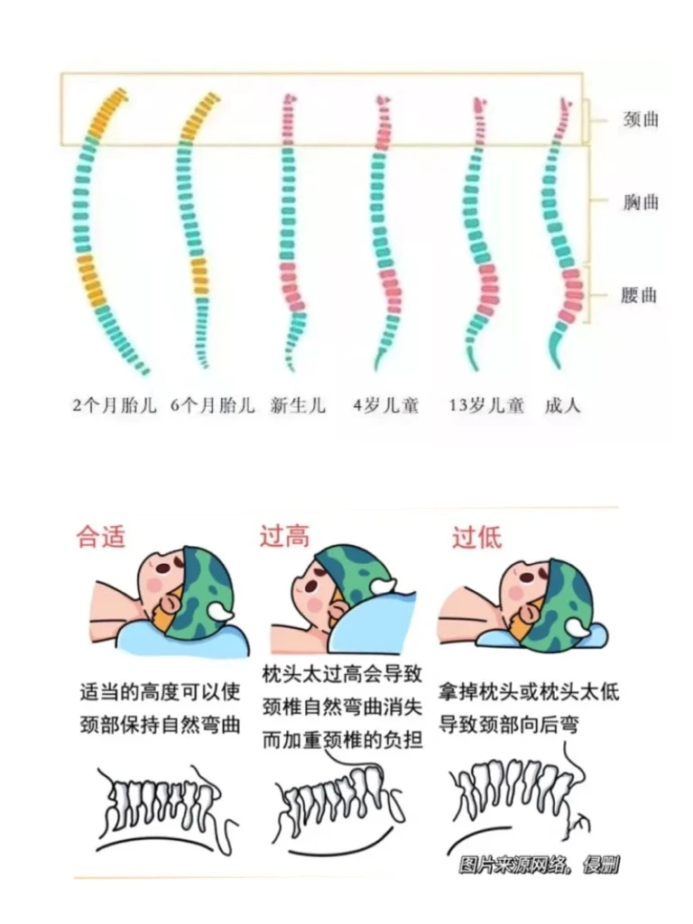 2️⃣3~6个月:第1个生理弯曲(颈曲)形成,枕头高度不超过1cm,可用毛巾对折替代枕头,或使用中间凹槽没有高度的定型枕。