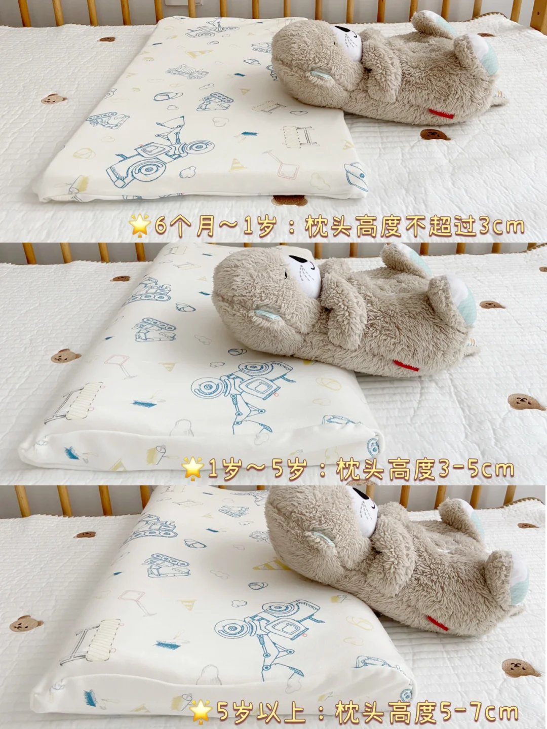 3️⃣6个月~1岁:第2个生理弯曲(胸曲)形成,枕头高度不超过3cm。