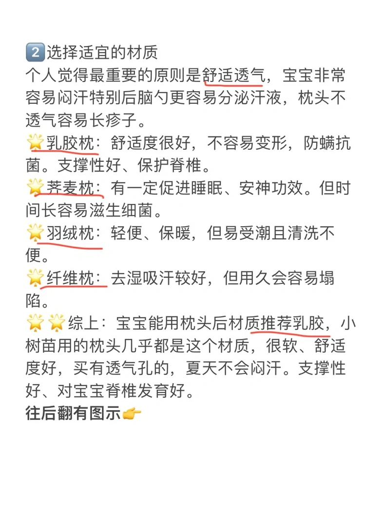 🌟🌟综上:宝宝能用枕头后材质推荐乳胶,小树苗用的枕头几乎都是这个材质,很软、舒适度好,买有透气孔的,夏天不会闷汗。支撑性好、对宝宝脊椎发育好。