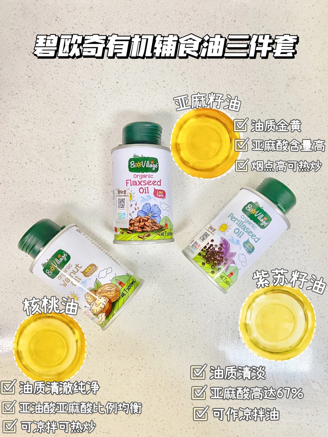 碧欧奇家的辅食油,之前也分享过很多次了,最近专门又入了他家小罐装的辅食3件套,分别是核桃油、亚麻籽油、紫苏籽油,小小一罐,包装很迷你可爱,每罐只有100ml,缝隙瓶口很好控制用量,3种油换着吃也不会浪费。