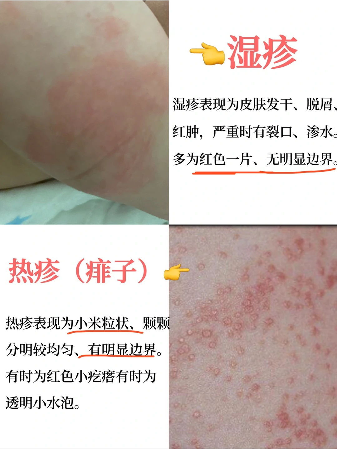 小米粒状、颗颗分明较均匀、有明显边界。有时是红色小疙瘩,也有透明水泡状。保持清爽透气会好转。