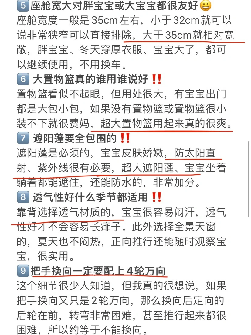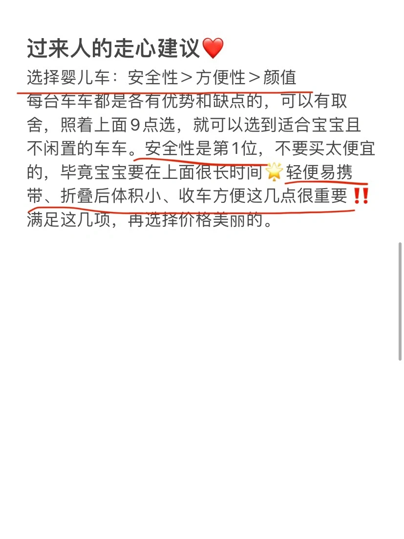 每台车车都是各有优势和缺点的,可以有取舍,照着我列举的要点,再看参数,就可以选到适合宝宝且不闲置的车车。