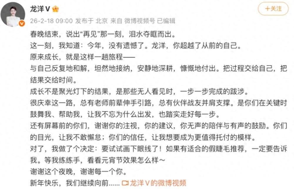 龙洋发长文,称主持完春晚哭了,超越了从前的自己,还做了个决定:要试试画下眼线。