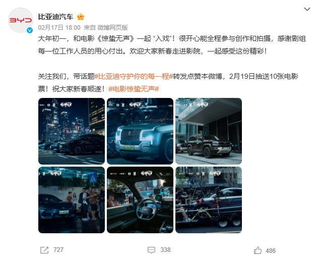 惊蛰无声 春节档张艺谋新作《惊蛰无声》热度狂飙,比亚迪携全品牌矩阵强势出镜,成为银幕最亮眼的“中国智造名片”。方程豹化身国安小队专属座驾,气场拉满;雷佳音、杨幂驾乘腾势Z9GT,科技感与高级感双在线;易烊千玺、朱一龙对手戏在元PLUS内高能上演。腾势N7、D9、仰望U8、海狮、秦PLUS等车型无缝融入剧情,覆盖全场景,尽显品牌实力。不止大银幕,比亚迪在剧集赛道同样高光。《绝密较量》中高圆圆驾驭仰望,优雅与气场兼备;《他为什么依然单身》里仰望U8连售五台,高端魅力圈粉无数。从追捧外资到偏爱国货,影视圈的选择,正是市场对中国汽车的最好认可。比亚迪以技术、品质与设计,在顶级作品中实力刷屏,书写国产汽车的时代自信。