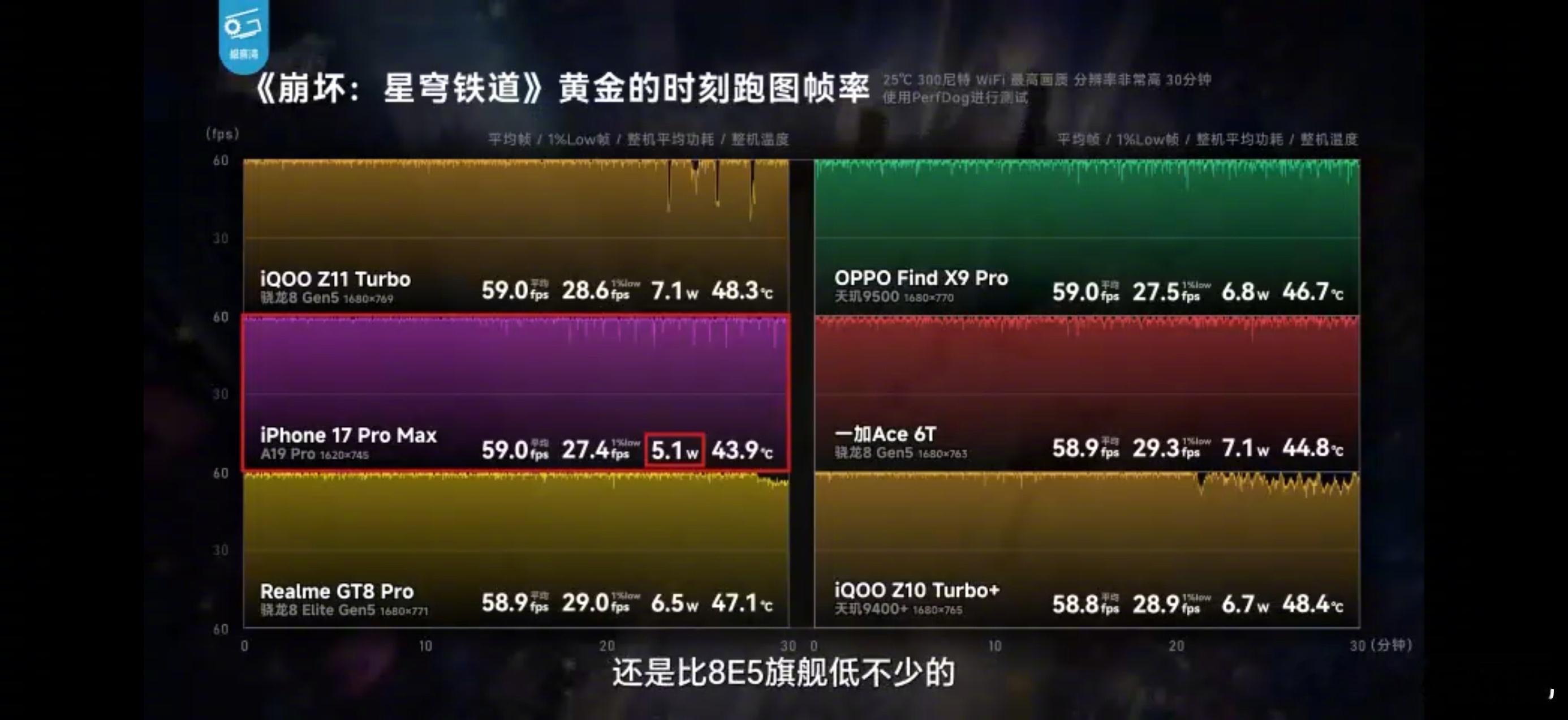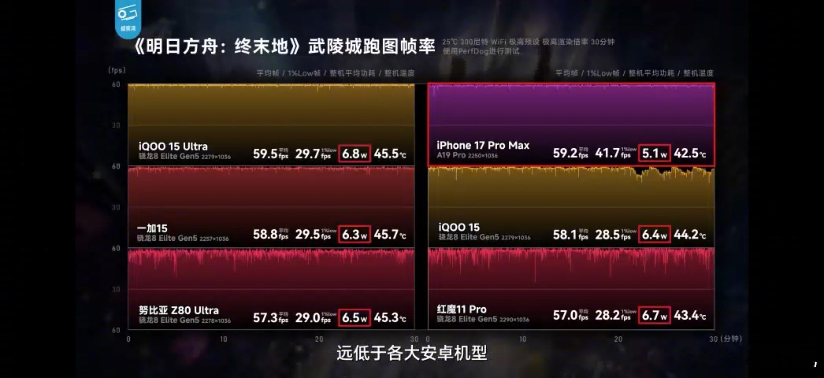 17PM 在帧率、功耗和温度上都要明显优于其他安卓旗舰。尽管还有 iQOO 15U 这种自带物理外挂的,能做到差不多的帧率变现,但功耗还是压不下来(图一)