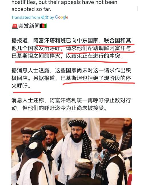 阿富汗被巴基斯坦打怕了,阿富汗塔利班主动求和!2月27日,根据阿富汗时报报道,阿富汗塔利班正呼吁中东国家、联合国和其他几个国家帮助调解与巴基斯坦的停火并停止正在进行的冲突。阿富汗塔利班一再敦促停止敌对行动,但塔利班的呼吁迄今尚未被接受。