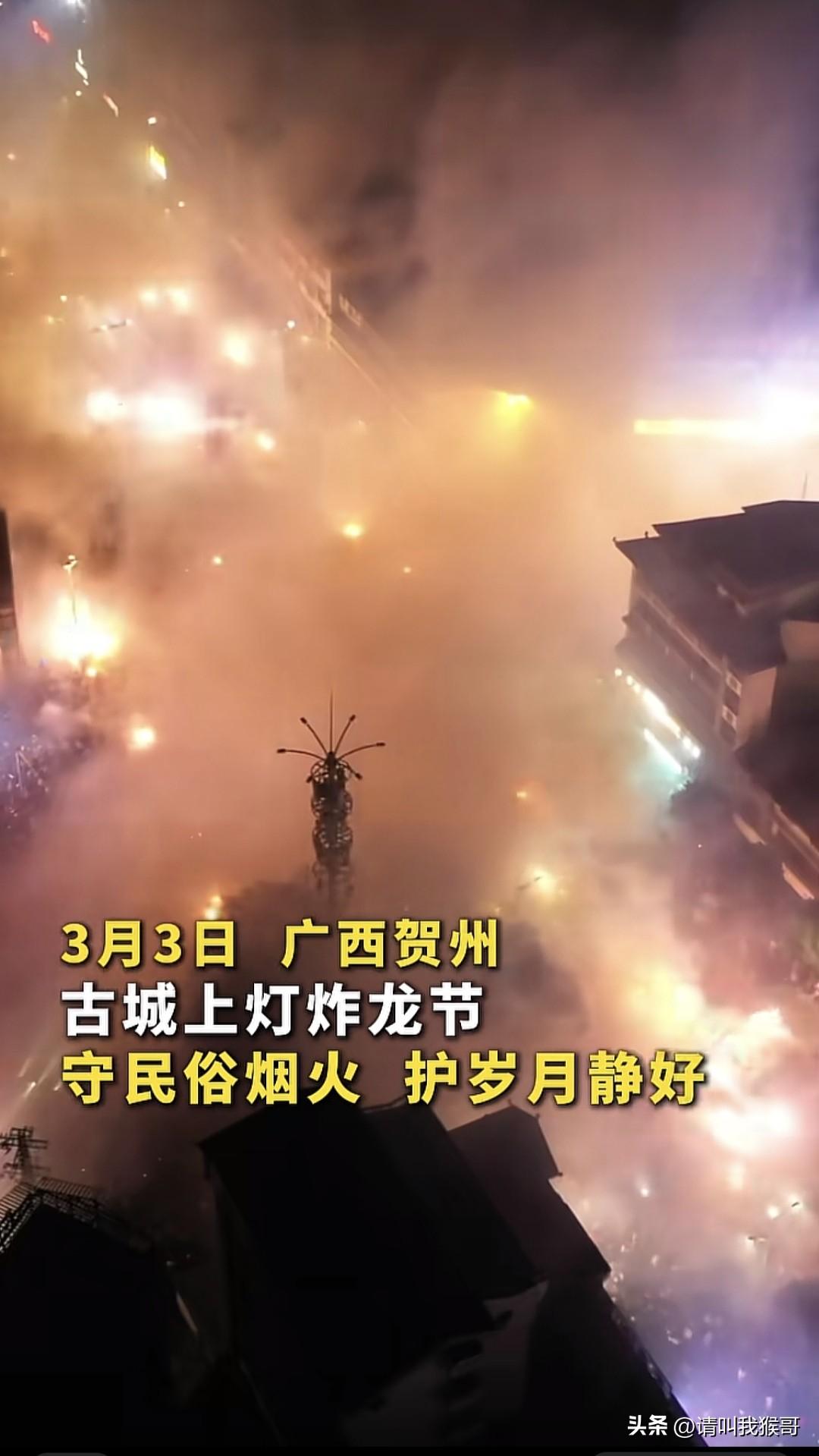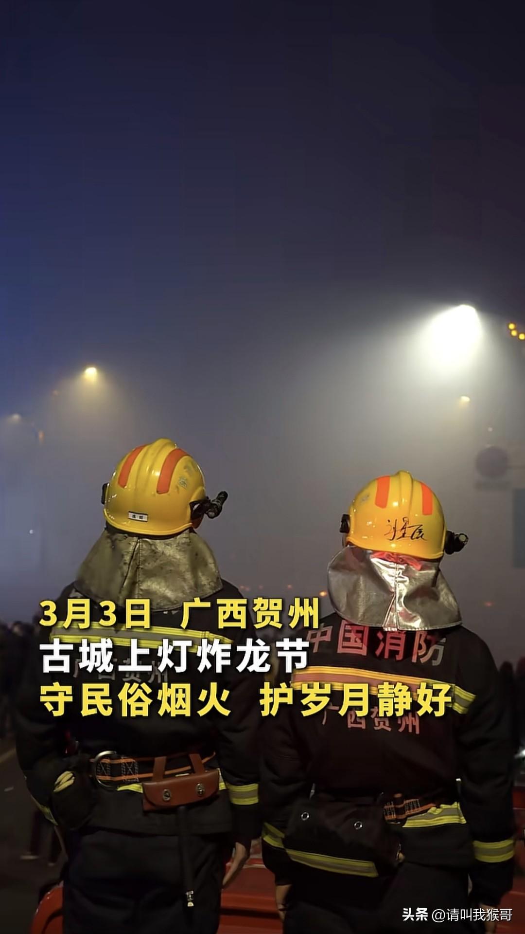 为广西贺州的消防战士点赞!3月3日广西贺州古城上灯炸龙节上,一边是热闹非凡的人间烟火,一边是坚守岗位守护人家的消防官兵。他们穿上消防装备,一直跟在闹元宵的龙灯队伍后面,等到烟花爆竹燃尽,队伍过去了,他们就在后面用灭火器、水枪等工具把一路上潜在着火隐患的火星灭掉,正因为有了他们的默默守护,这样的民俗传统举办的才没有后顾之忧,让大家心里更增添一份热闹!