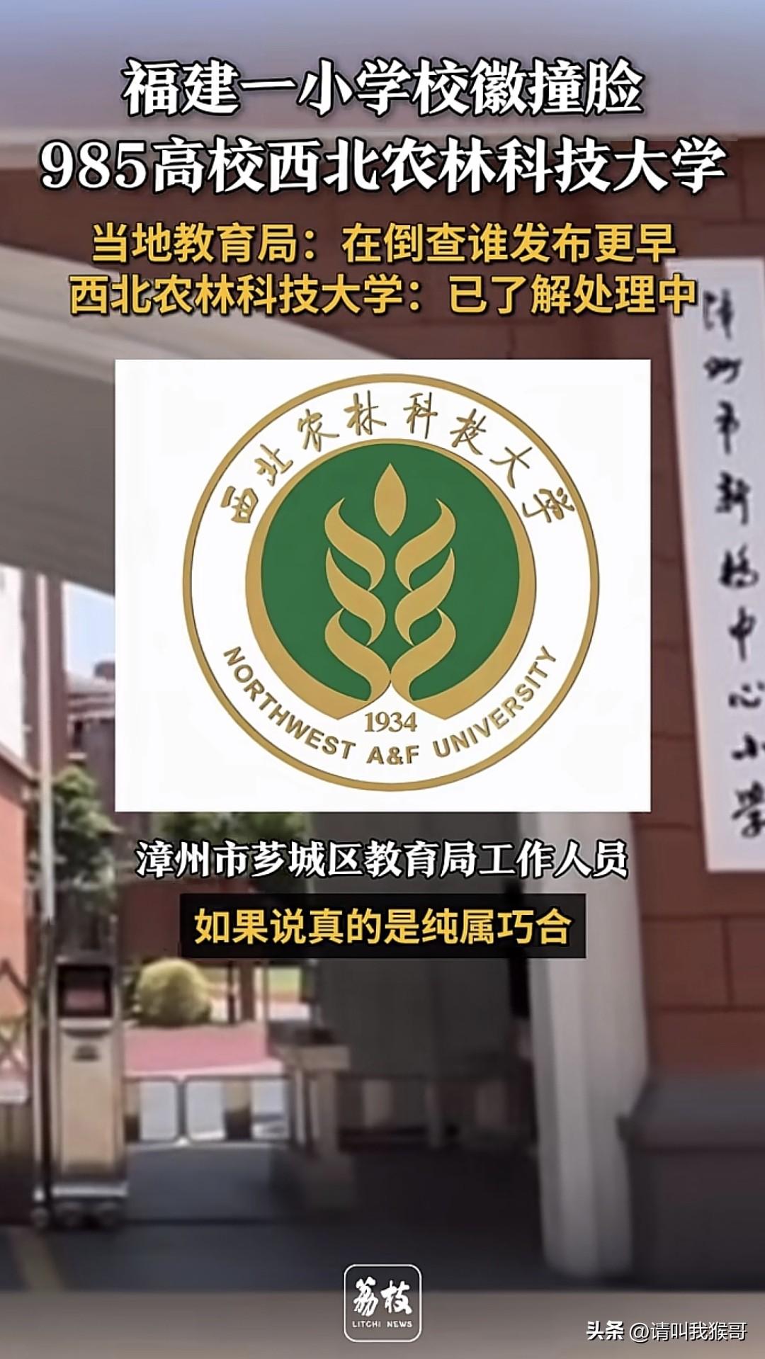 好巧不巧,福建一小学校徽“撞脸”西北农林科技大学,无论是里面的麦穗样式,还是颜色和底色,基本上都是差不多。目前根据漳州市教育局工作人员回应,在倒查谁发布的更早。要说是巧合的话,可能性不大,毕竟细节上太多相似的地方。有网友调侃说,索性让小学改名为“附属小学”,这样一来就解决了“撞脸”问题。但如果真的纯属巧合的话,那真的就是一种缘分呢。