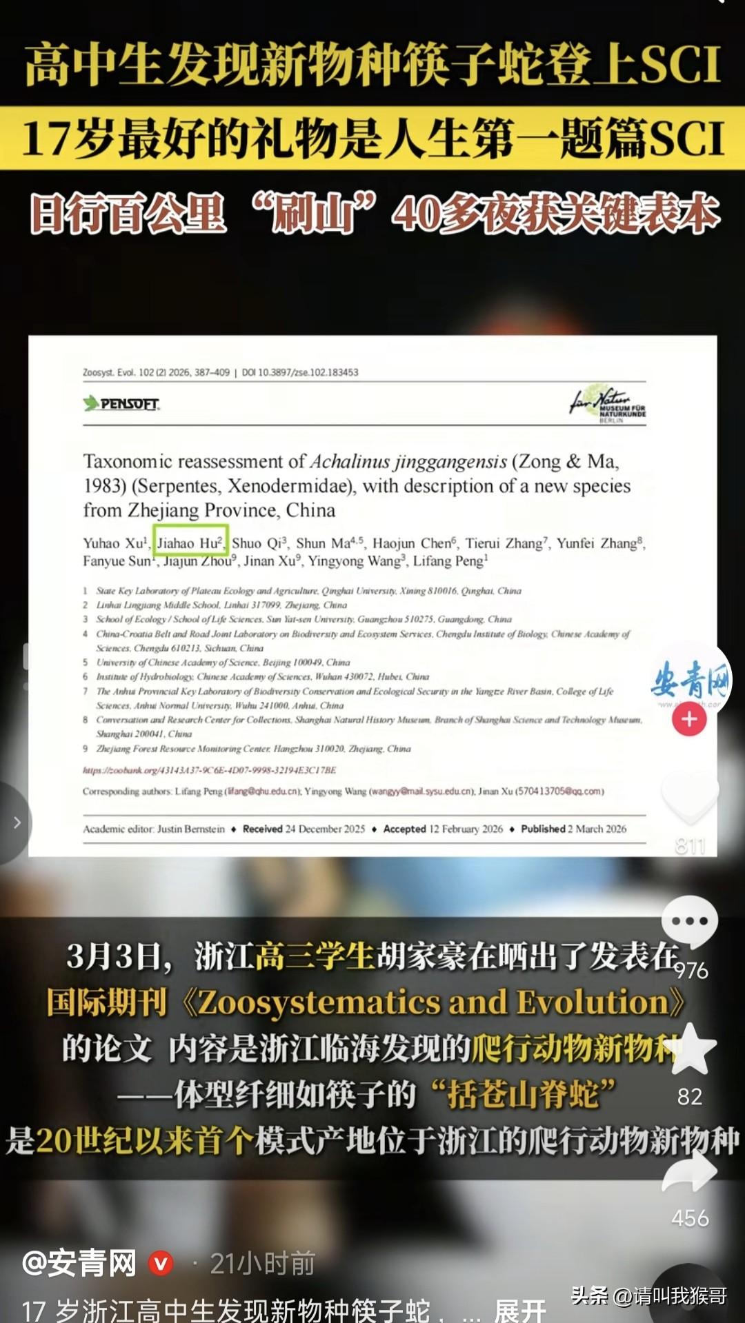 为什么大家都质疑这个发现新物种“筷子蛇”的17岁高中生呢?综合了一下网友的观点,大概有三点。一是高中备考期间,先不说学校会不会批准这个假,谁会请假40多天去“刷山”。二是报道中提到的“日行百公里”,毕竟平地一天走一百公里都相当困难,何况在山区。三是接受采访的画面显示他的肤色不像在野外待了40多天的样子。因为上述原因,也难怪大家质疑了。