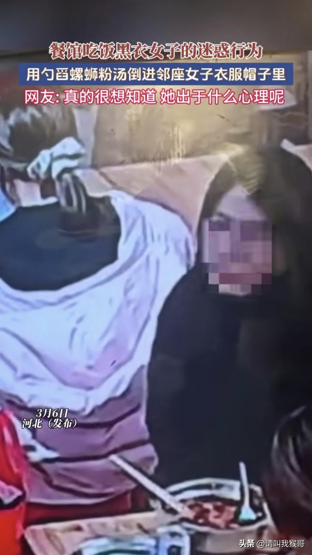 有的人真的天生就是坏种!河北某餐馆,一黑衣女子在吃螺蛳粉,结果毫无征兆的用勺子将螺蛳粉汤水舀到后面坐着的白衣女子风帽上面,弄完了又若无其事的吃自己的螺蛳粉。估计这个人心理有病,不然怎么会无缘无故的做这种损人不利己的事呢?这种人出门在外一点公德心都没有,哪天碰到硬茬子就老实了!