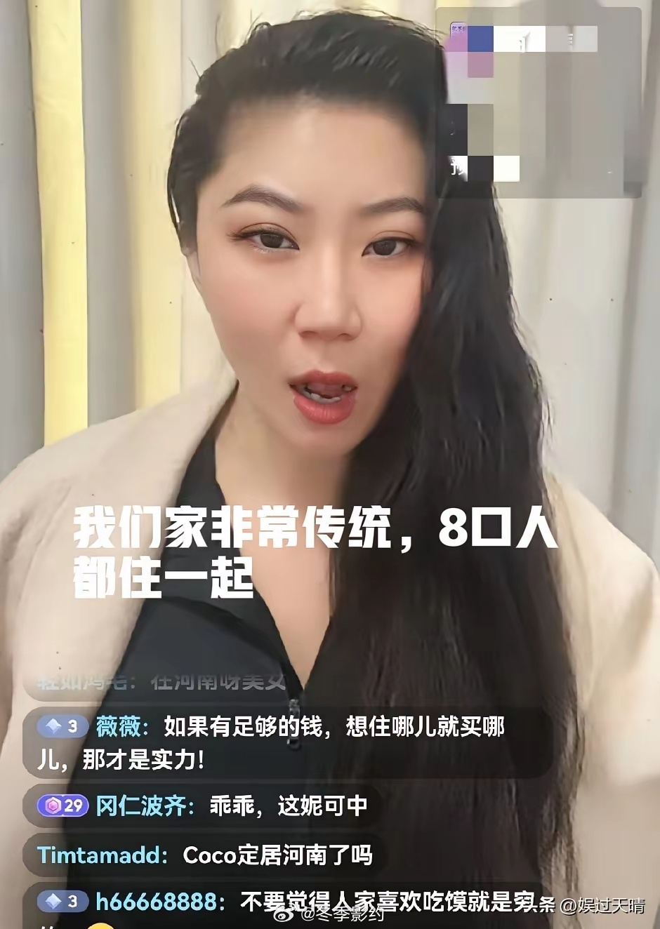 Coco在河南一直住在娘家,有网友问她:“你是没钱买房子吗?一直住娘家。”Coco:“我回河南和家人住一起不是因为我没买房子,是因为我们家是非常传统的家庭,爸爸妈妈,弟弟弟媳,三个孩子,还有姑妈,8口人生活在一起,非常的和谐团结。”Coco很少回河南,这次过年在河南待了快一个月了,一直住在娘家,而娘家人口众多,她每天直播的时候,外面都吵吵闹闹的。所以有网友问她没钱买房子吗?为什么要一直住在娘家?这话就刺激到了Coco,Coco和网友解释了很久,从介绍他们的家庭氛围,到传统文化,最后甚至问网友,是不是要她把房产证拿出来,才能证明她有钱?看得出来Coco很介意网友说她没钱,她很想证明自己是有实力买房的,只不过在河南没必要买房,她又不常住河南,没有结婚,偶尔回娘家住一段时间没有任何问题。不过Coco说自己家很传统,这点就有点招人笑了,真的传统家庭能允许自己的女儿和大49岁的男人在一起十几年吗?