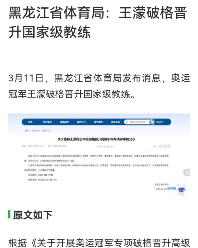 王濛拟被破格晋升王濛拟被破格晋升国家级教练 黑龙江省体育局发布公示:《关于推荐王濛同志破格晋升高级职称(国家级教练)专项评审的公示》,经个人申请、单位推荐及主管部门审核,拟推荐王濛同志破格申报国家级教练职称评审。