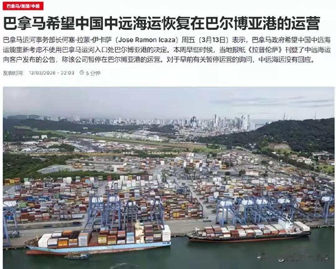 巴拿马强行接管中资运营港口的闹剧,很快迎来戏剧性反转。在中远海运暂停巴尔博亚港业务仅3天后,巴拿马运河事务部长便公开低头,承认中方货运至关重要,急切希望恢复运营。